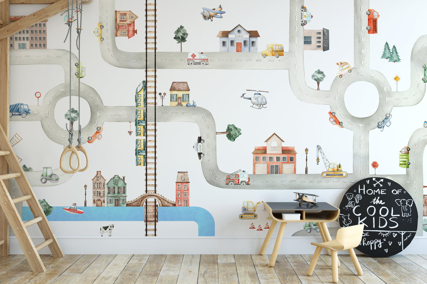 Kids room wallpaper with colorful vehicles and city design