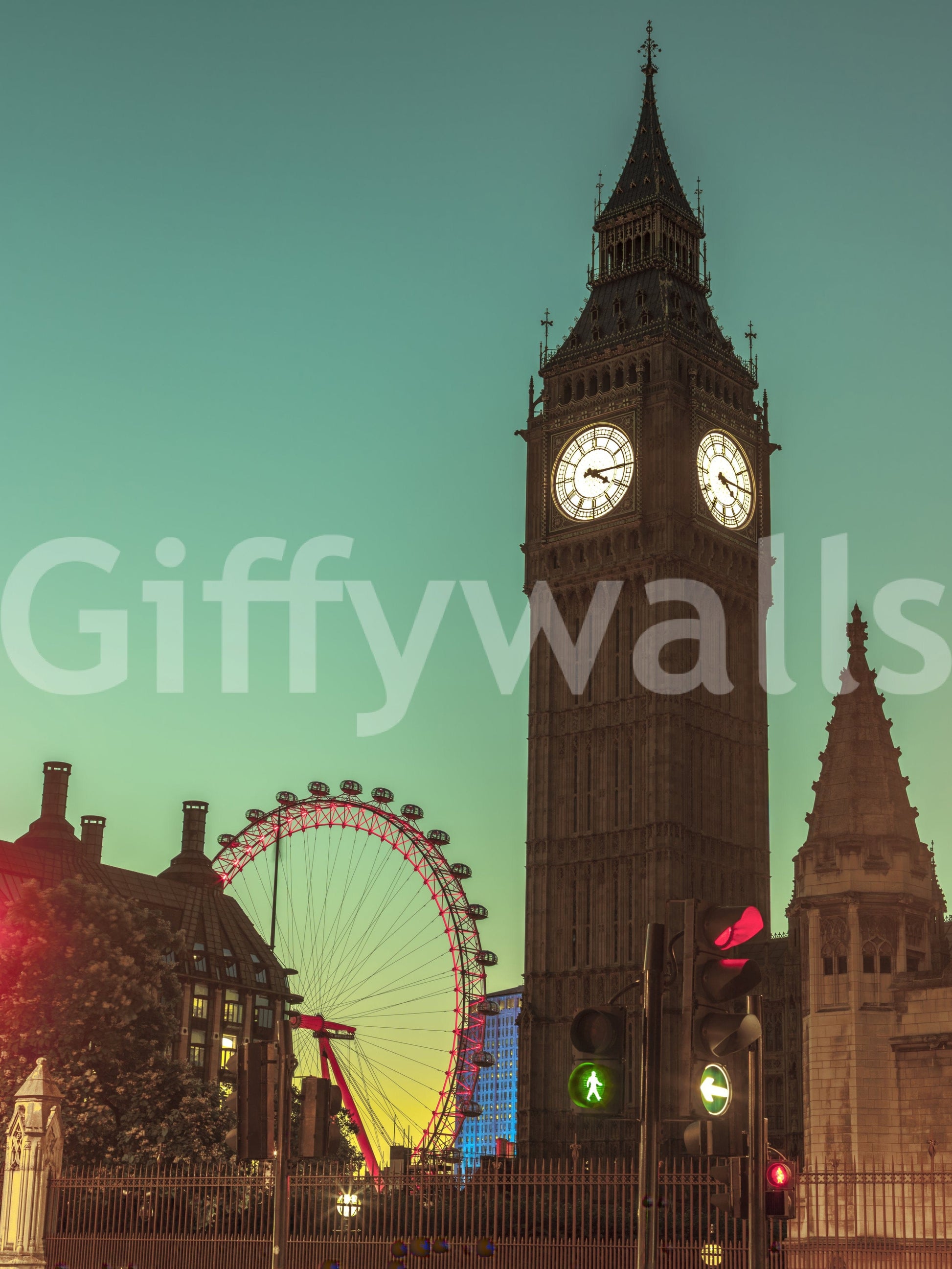 View of Big Ben from street, London, UK. Adorn your space with "City Timepiece," an evocative art piece that captures the majestic essence of London at twilight. The iconic silhouette of Elizabeth Tower, affectionately known as Big Ben, dominates the scene, its illuminated clock face a beacon against the serene teal sky. Beside it, the graceful arc of the London Eye paints the skyline with a delicate dance of light and shadow. This piece encapsulates the rhythm and pulse of urban life, where history and modernity intertwine. The warm glow emanating from the clock and the vibrant hues of the distant cityscape create a captivating ambiance, perfect for adding a touch of sophisticated charm to any room. Let this artwork transform your wall into a window overlooking a timeless metropolis, a daily reminder of enduring elegance and the ceaseless passage of time.