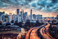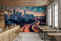 Elevate your interior with this striking cityscape vista. This dynamic design captures the energy of urban life during the magical hour of dawn. Observe sleek skyscrapers rise against a sky painted with soft hues, while ribbons of light trace the paths of bustling roadways. The wallpaper for walls introduces a sense of forward motion and vibrant living to living rooms, offices, or entryways. The rich colour palette and meticulous detail offer a sophisticated aesthetic that harmonises with modern and minimalist décor. Transform your space into a contemporary haven with this captivating urban panorama.