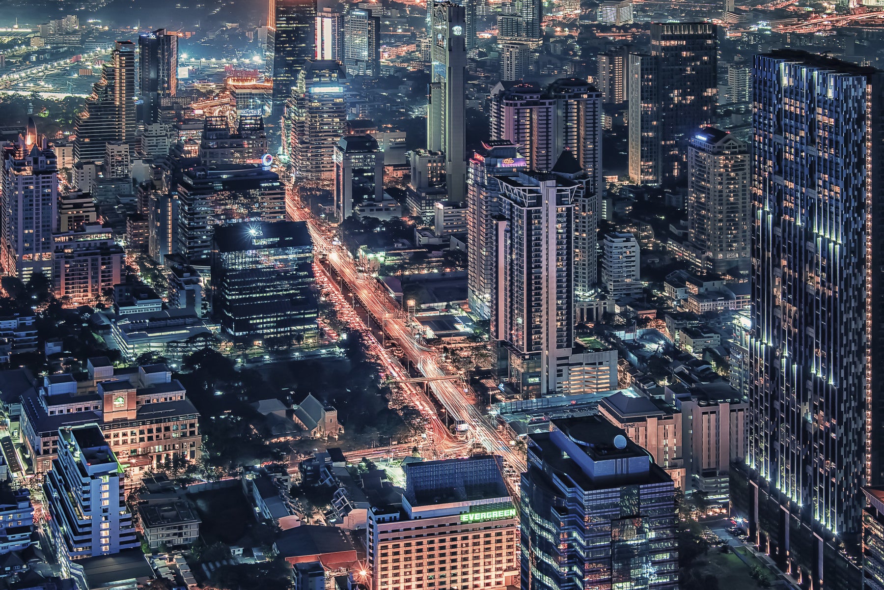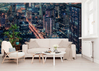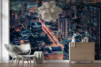 Bring the energy of the city to your home with this striking cityscape night wallpaper for walls. The design features an aerial view of a sprawling metropolis at night, highlighting illuminated skyscrapers and vibrant traffic arteries. The contrasting colours create a dynamic effect, making it a statement piece for any room. Ideal for enhancing the atmosphere of a living room, dining area, or office, this bold wallpaper offers a captivating and sophisticated urban panorama.
