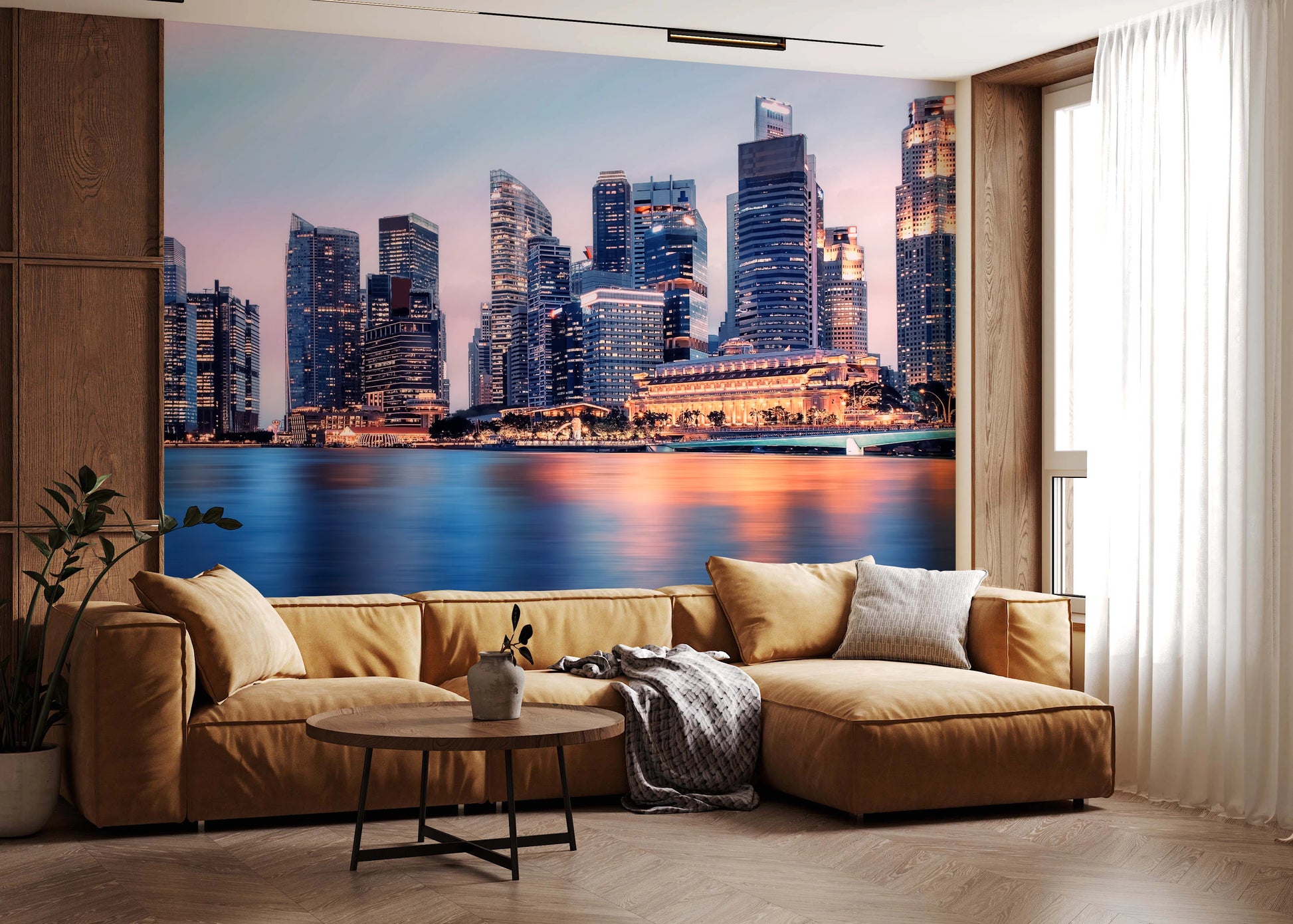 Transform your space with this breathtaking cityscape wallpaper for walls. The design captures a stunning skyline bathed in the soft glow of twilight, with the city's lights mirroring beautifully on the water's surface. The cool blues and warm oranges create a calming yet vibrant atmosphere. This wallpaper works wonders in living rooms, bedrooms, or even a home office, adding depth and sophistication. It complements modern and minimalist interiors, bringing a touch of urban elegance to any room. Let this cityscape become the centrepiece of your interior design.