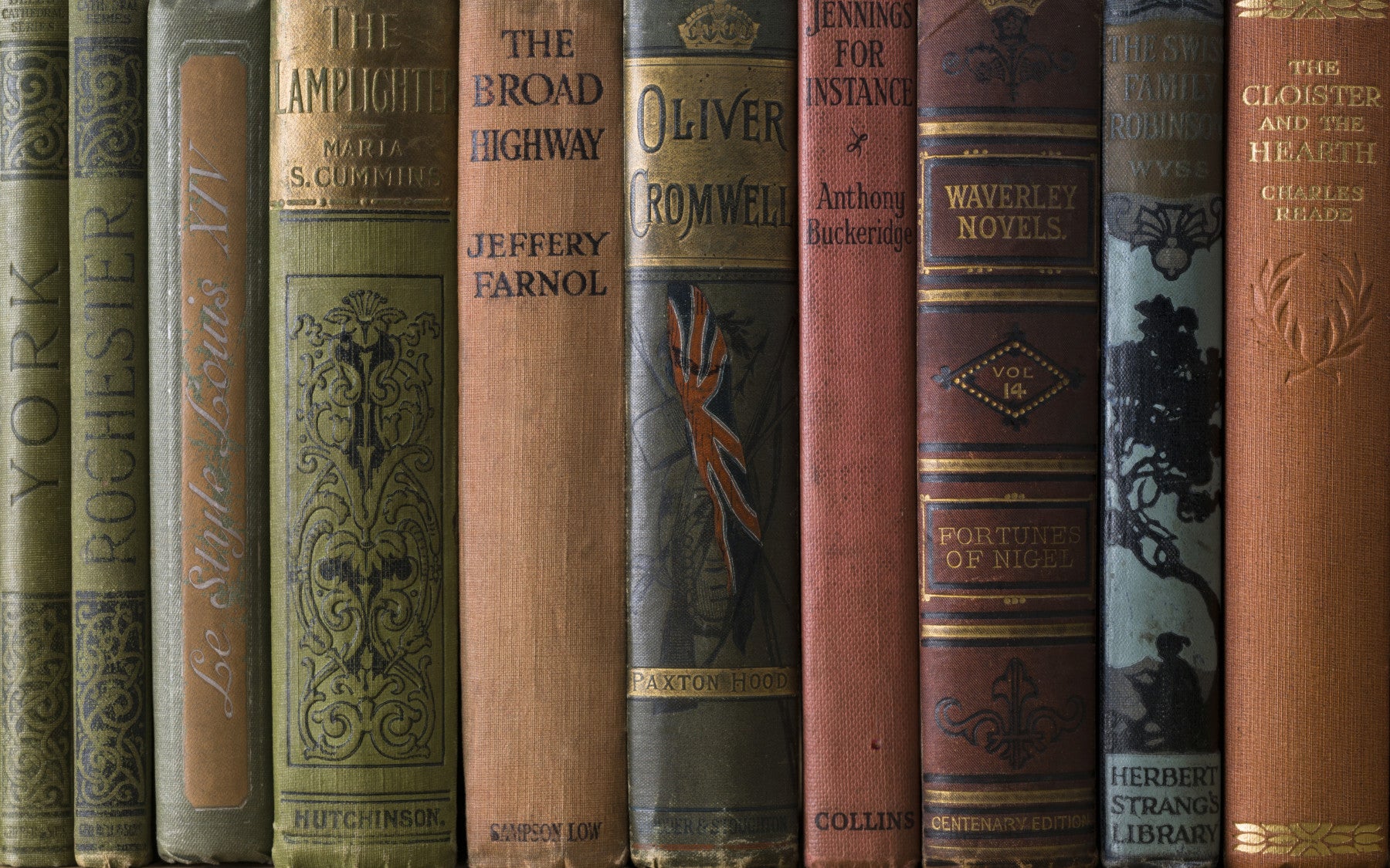 Detailed book spines with rich textures and elegant fonts