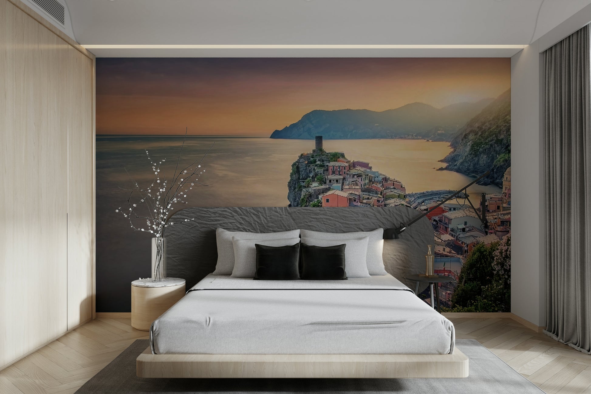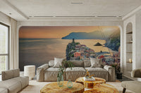 Capture the allure of coastal Italy with this breathtaking wallpaper for walls. The image showcases a vibrant village perched on a rugged cliff, bathed in the warm glow of sunrise or sunset. Pastel hues paint the buildings, contrasting against the deep blues of the ocean. This design creates a sense of serenity and adventure. It suits living rooms, bedrooms, or studies, adding a touch of wanderlust and a splash of colour.