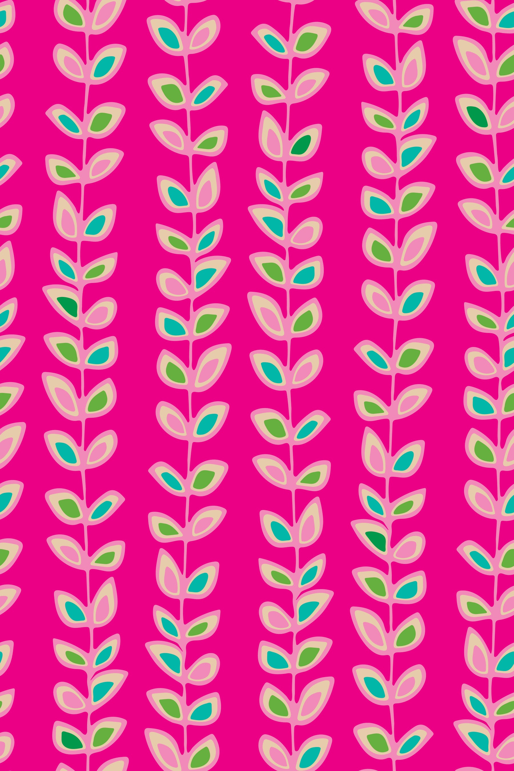 Colorful leaf designs arranged along upward vine stripes against a vivid fuchsia wallpaper background.