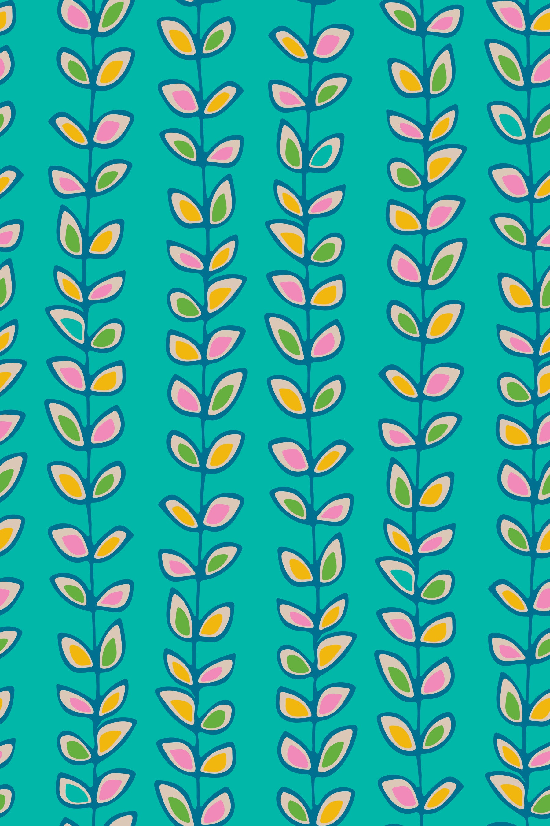 A turquoise wallpaper decorated with repeating vertical vines and outlined multicolored retro leaves.