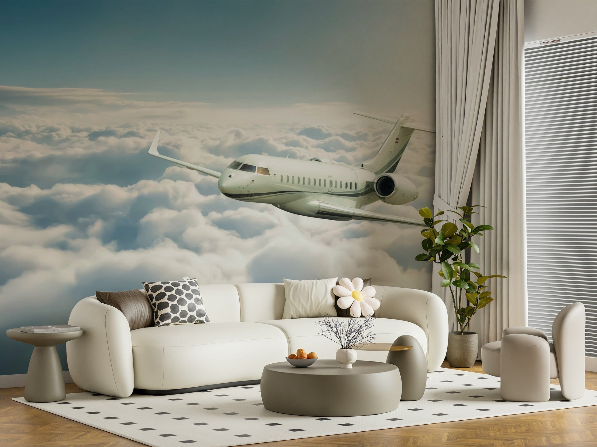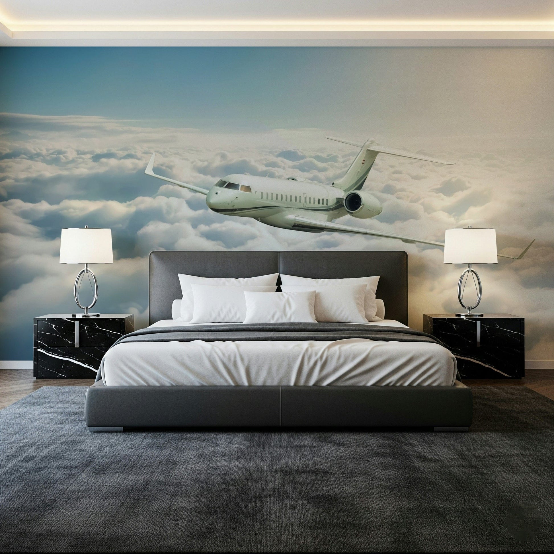 Soar to new heights with this stunning wallpaper for walls. Depicting an aircraft gliding through a sea of fluffy clouds, this design brings a sense of wonder and adventure to any space. The soft, muted tones of white, blue and grey create a calming and expansive atmosphere. Install this wallpaper in a home office to inspire productivity, in a living room for a touch of sophistication, or in a bedroom to promote relaxation. This imagery will open up the room and instill a feeling of freedom, creating a visually captivating backdrop that complements various interior styles.