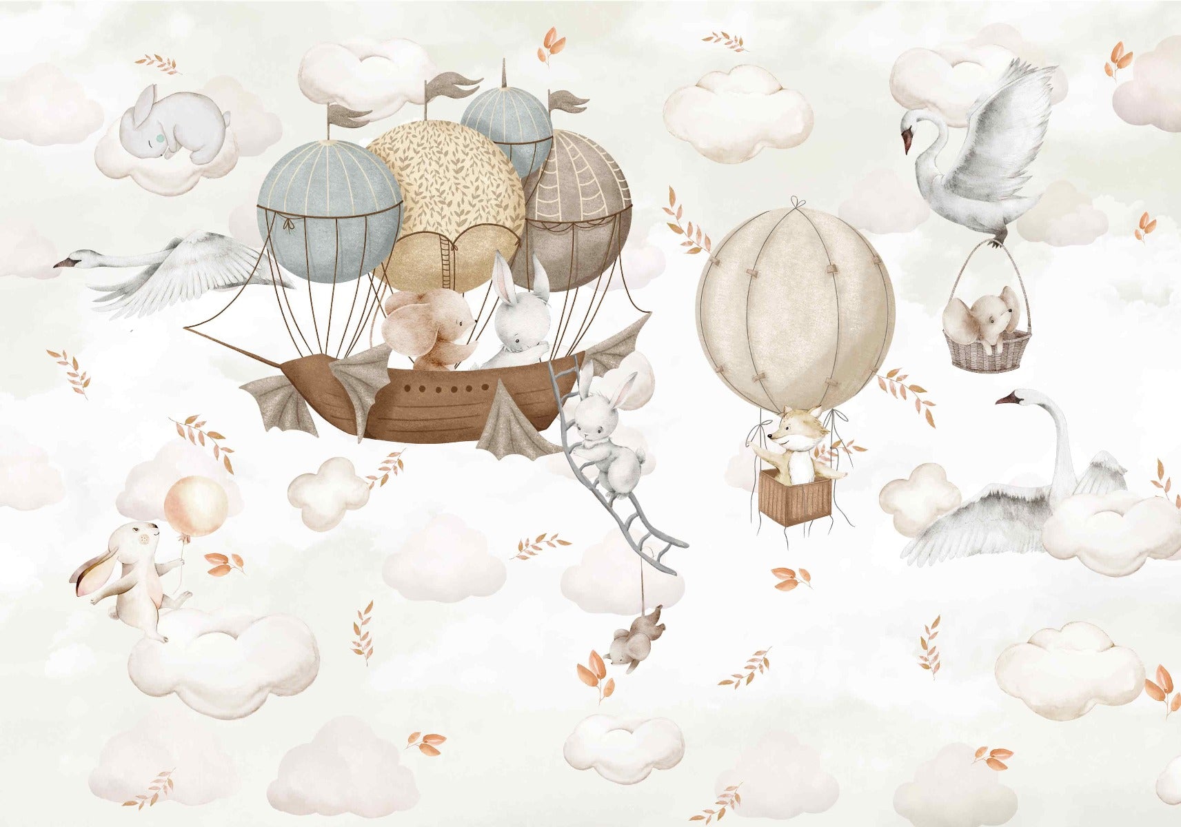 Give your child's room a delightful upgrade with the cloud-hopping critters kids room wallpaper. This charming design features adorable animals in hot air balloons, gently floating among fluffy clouds, creating a scene that sparks imagination and fun. The soft color palette ensures it fits seamlessly into any room, providing a subtle yet enchanting backdrop for both stories and play. Ideal for bedtime storytelling or creative play, this kids room wallpaper makes each day a little more magical. Kids will love identifying the different animals as they drift off to sleep. Get yours now and transform their room into a sky-high adventure!