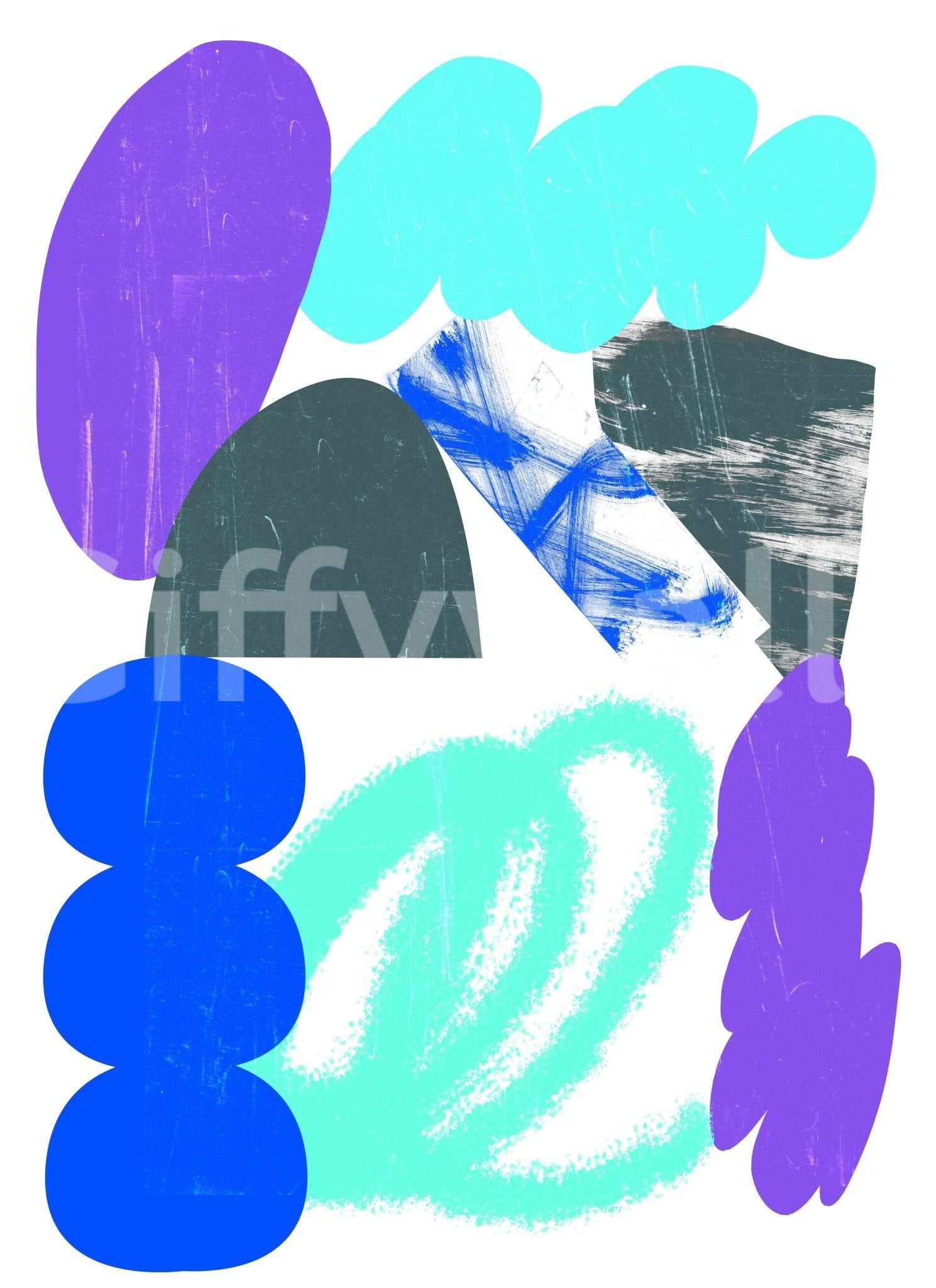 Drift away on a canvas of vibrant abstraction with 'Clouds'. This wallpaper reimagines the ethereal beauty of the sky in a playful, contemporary style. Bold shapes of purple, turquoise, and blue evoke the whimsical forms of cumulus clouds, while textured brushstrokes and layered elements add depth and visual interest. The white space provides a refreshing clarity, allowing the colours to pop and create a sense of lightness. More than just a design, 'Clouds' is an invitation to dream, to find joy in simplicity, and to bring a touch of modern art into your digital space. Perfect for those who appreciate a unique blend of artistic expression and serene ambiance, 'Clouds' will transform your screen into a gallery of sky-inspired wonder.