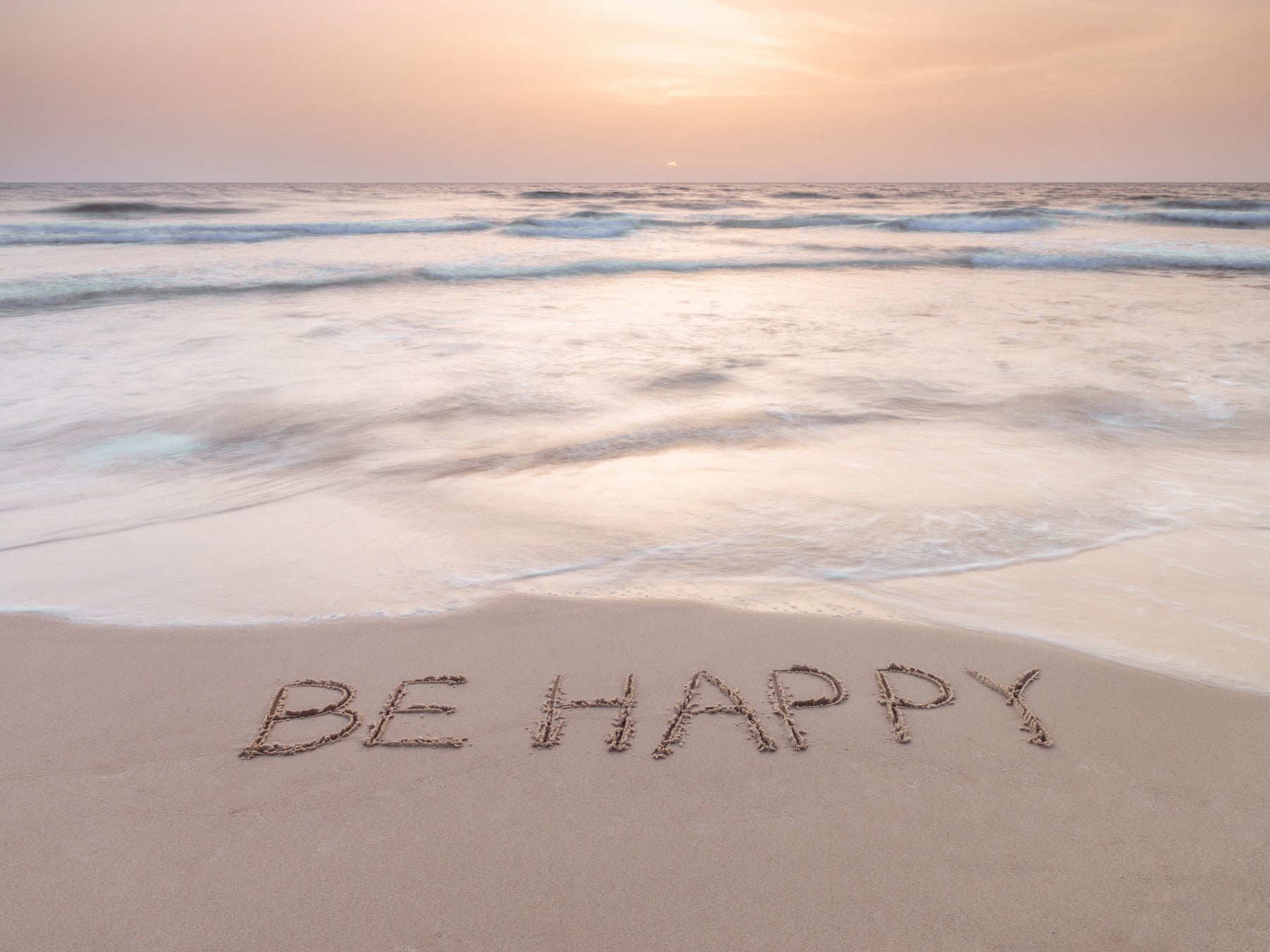 Coastal Affirmation wallpaper beach sand writing "Be Happy" waves mural.