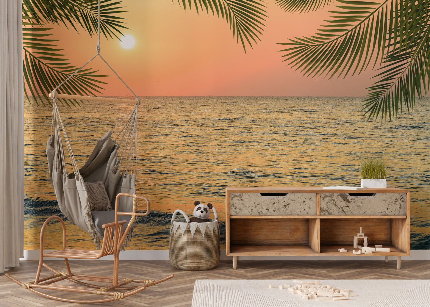 Coastal glow mural with palm leaves and sunset