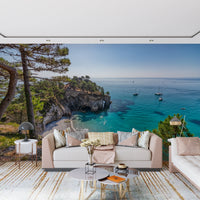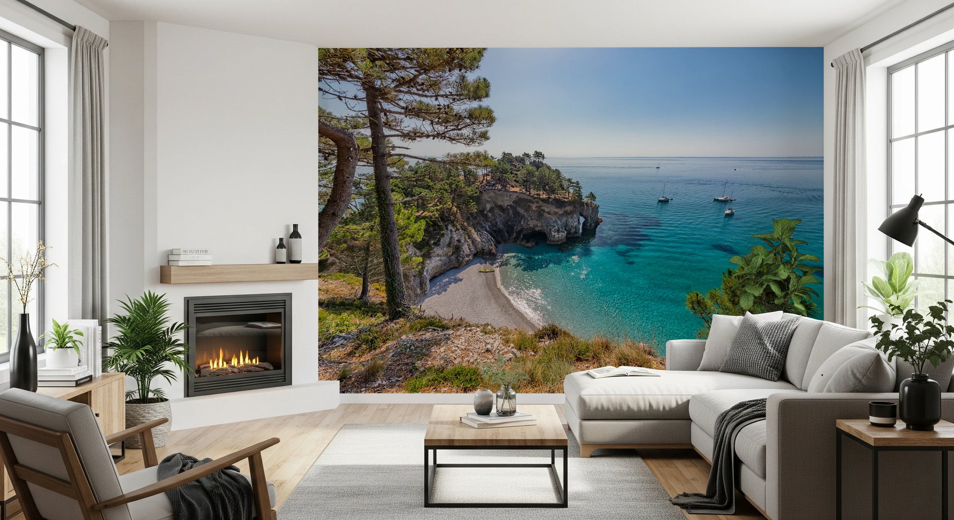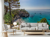 Bring a serene coastal escape into your home with this captivating wallpaper for walls. The design showcases a breathtaking view of a secluded beach with turquoise waters meeting a dramatic cliffside. Sunlight dances across the water, creating a luminous and inviting ambiance. Gentle blues and greens blend harmoniously, complemented by the earthy tones of the trees and shoreline. Ideal for a living room, bedroom, or office, this wallpaper enhances spaces with a sense of calm and natural beauty. It functions as a statement piece, making it a perfect feature wall.
