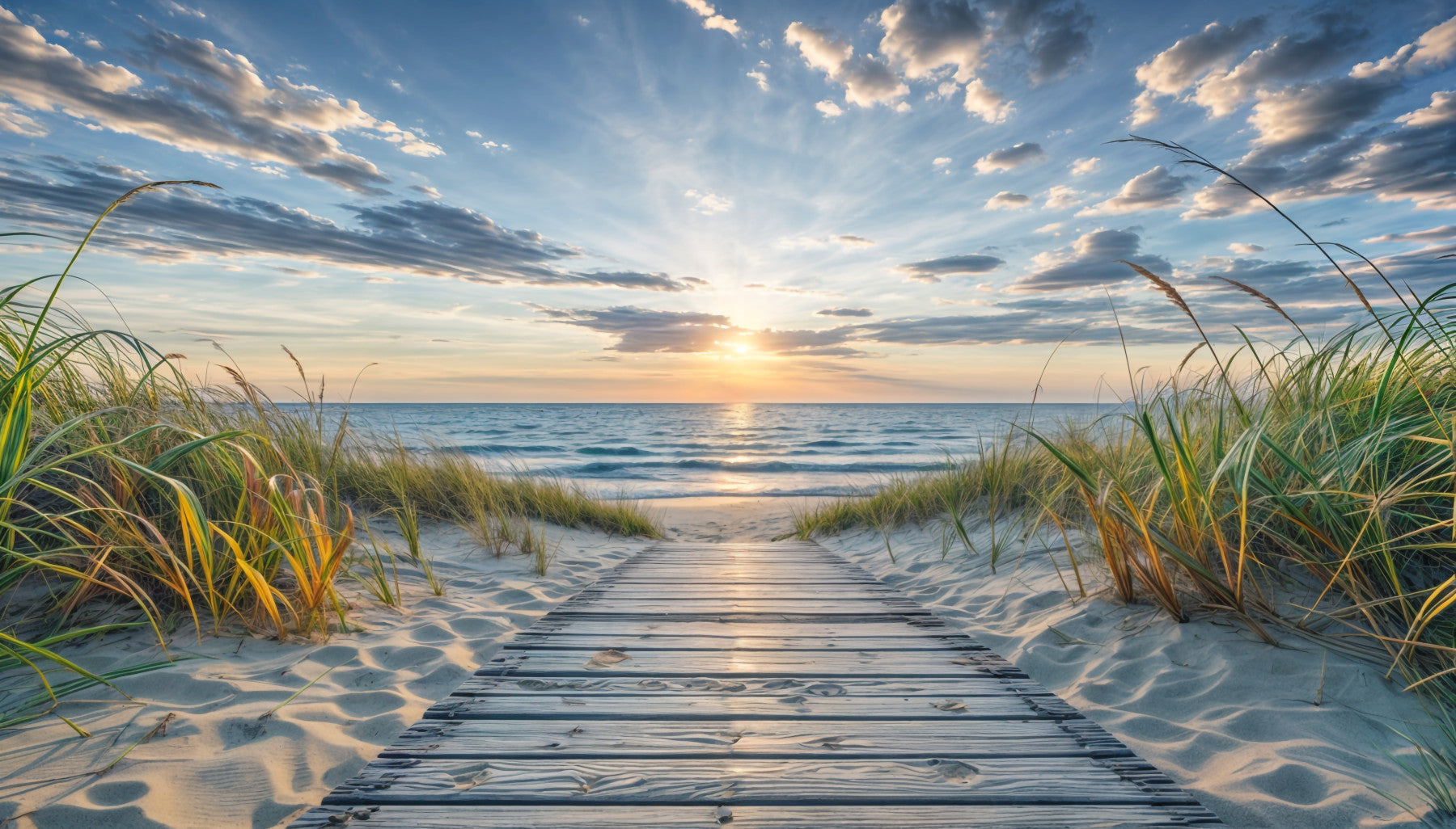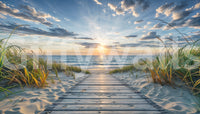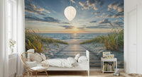 Bring the tranquility of the seaside into your home with this beautiful wallpaper for walls. A wooden boardwalk leads to a serene beach, bathed in the soft hues of a setting sun. Gentle waves meet the shore under a sky streaked with calming blues and oranges. The natural tones of the sand and sea grass create a soothing, organic feel. This design works wonderfully in bedrooms, bathrooms, or any space where you want to cultivate a relaxed, coastal vibe. Elevate your interior with this peaceful vista.