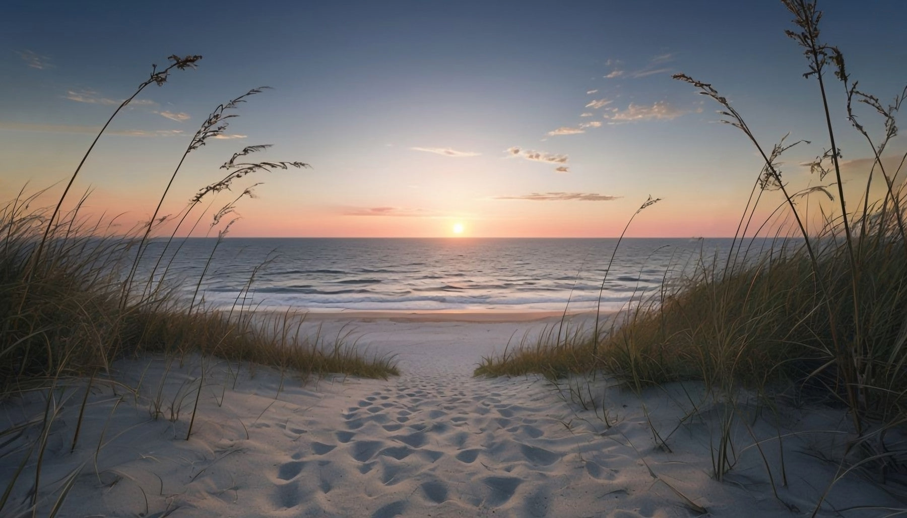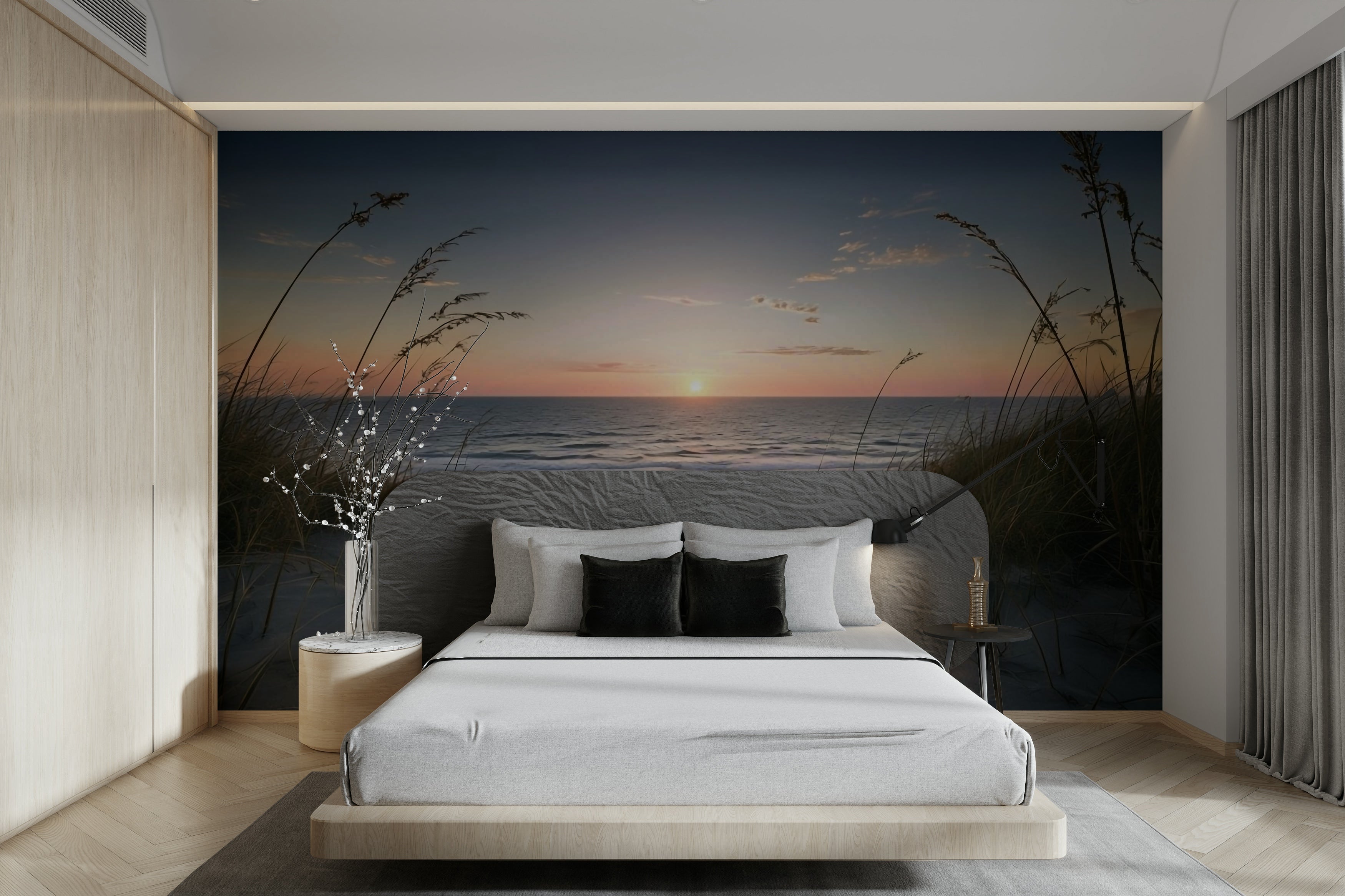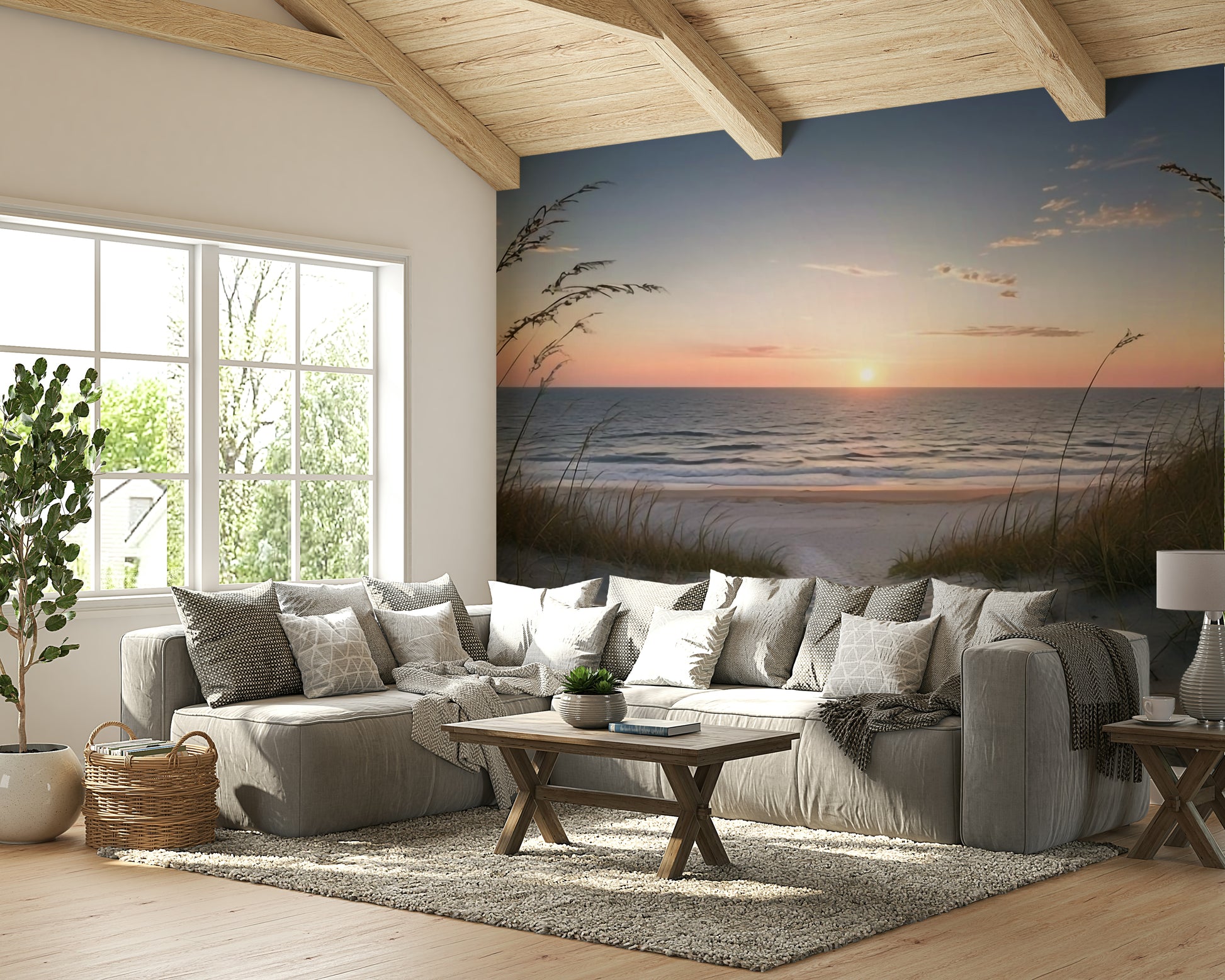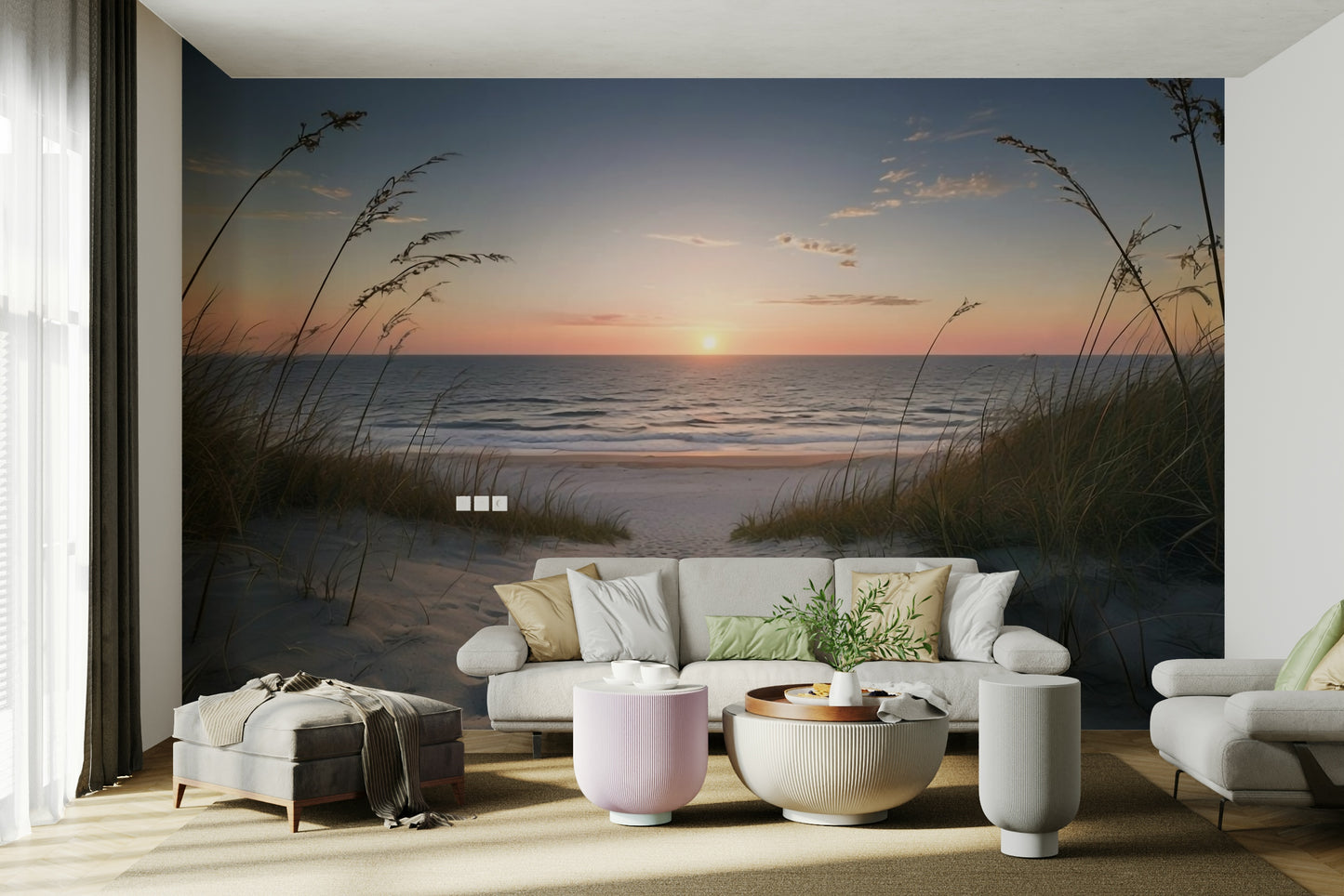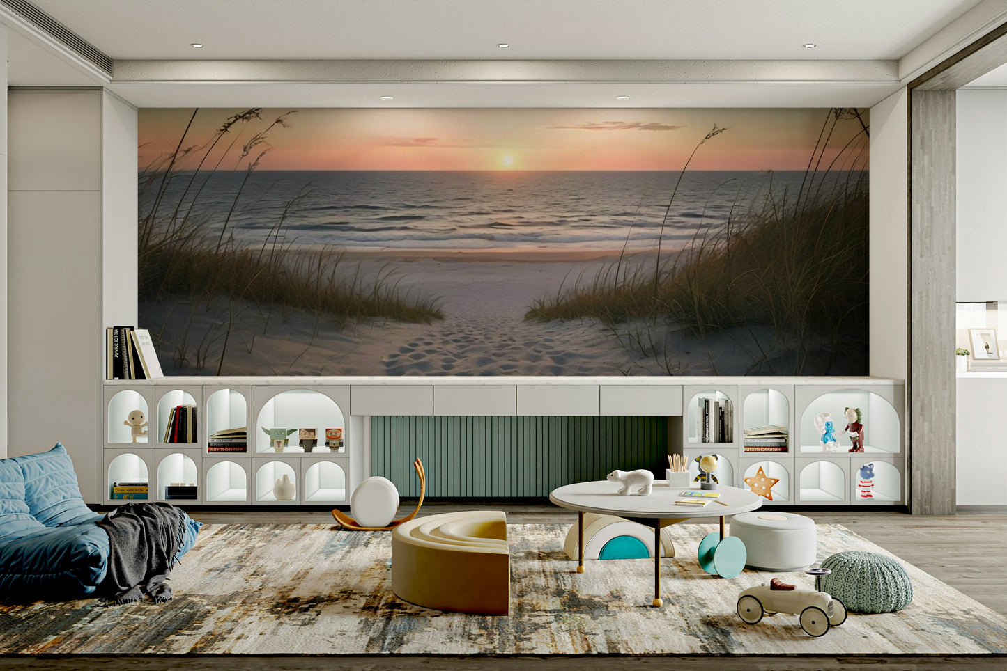 Discover a moment of serene escape with this captivating beach wallpaper. The image depicts a picturesque path winding through soft sand dunes, leading to the ocean's edge where a breathtaking sunset paints the sky with vibrant hues of orange, pink, and soft blue. The tall seagrass gently sways in the breeze, adding a touch of natural elegance. This wallpaper evokes feelings of peace, tranquility, and the calming rhythm of the ocean waves. It's ideal for creating a soothing atmosphere in your home—a perfect addition to bedrooms, living rooms, or any space needing a touch of coastal serenity.