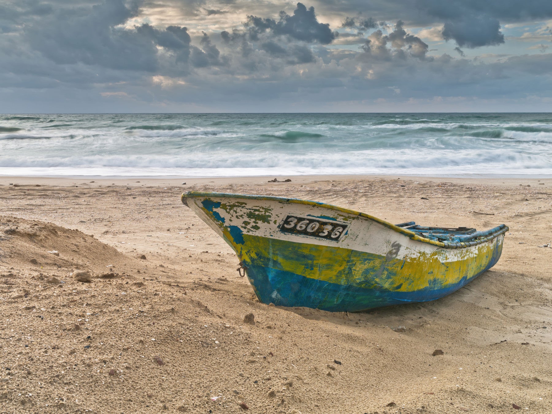 Fishing Vessel Mural Simple small boat waiting on the beach under dark clouds.