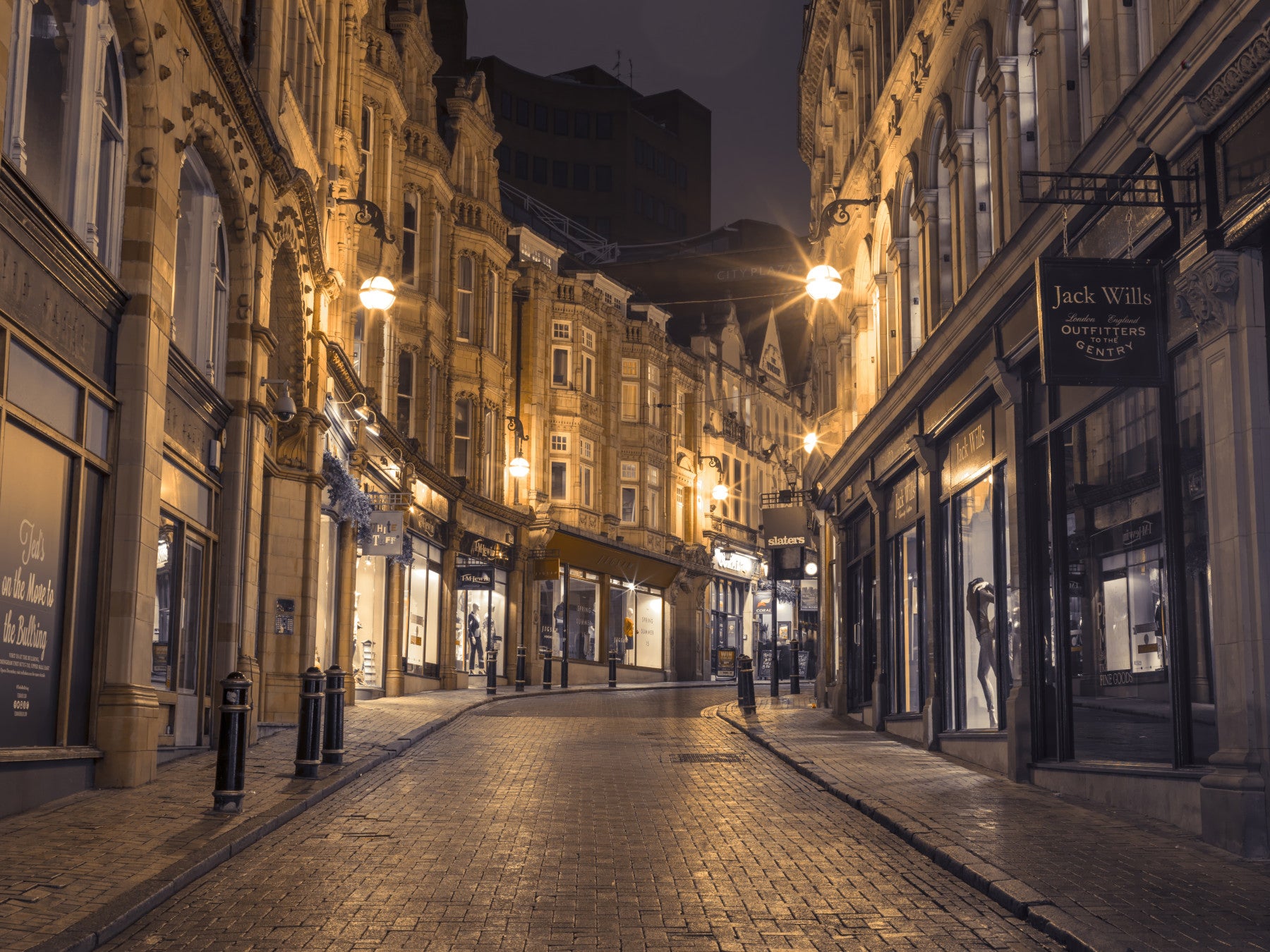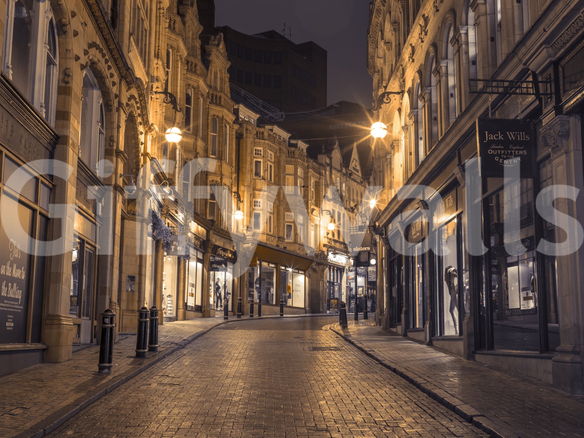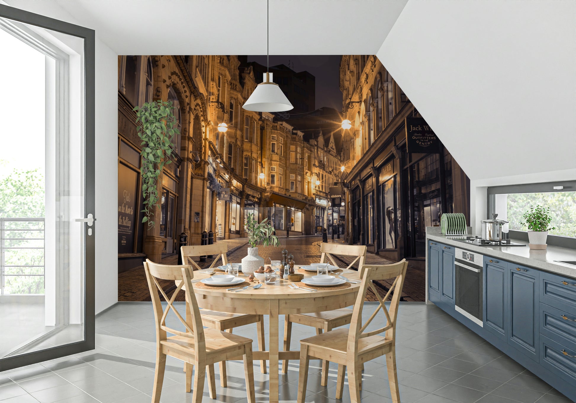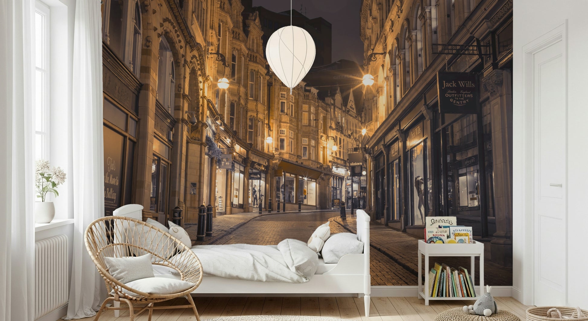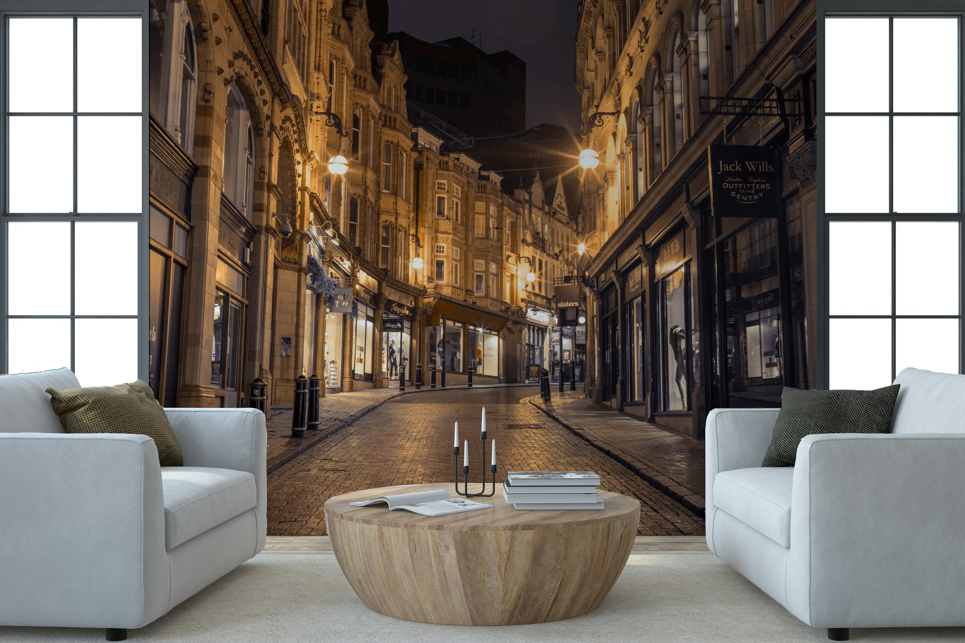 View of Cannon street at night, Birmingham, UK. Bring the charm of a bygone era into your home with this captivating wallpaper for walls. It depicts a historic cobblestone street illuminated by warm streetlights. The design showcases architectural details and inviting shopfronts, perfect for creating an ambience of timeless elegance. The muted, earthy tones lend themselves well to hallways, living rooms, or even a home office, creating a sense of depth and character. Transform your interior into a captivating scene of urban beauty with this stunning wall décor.