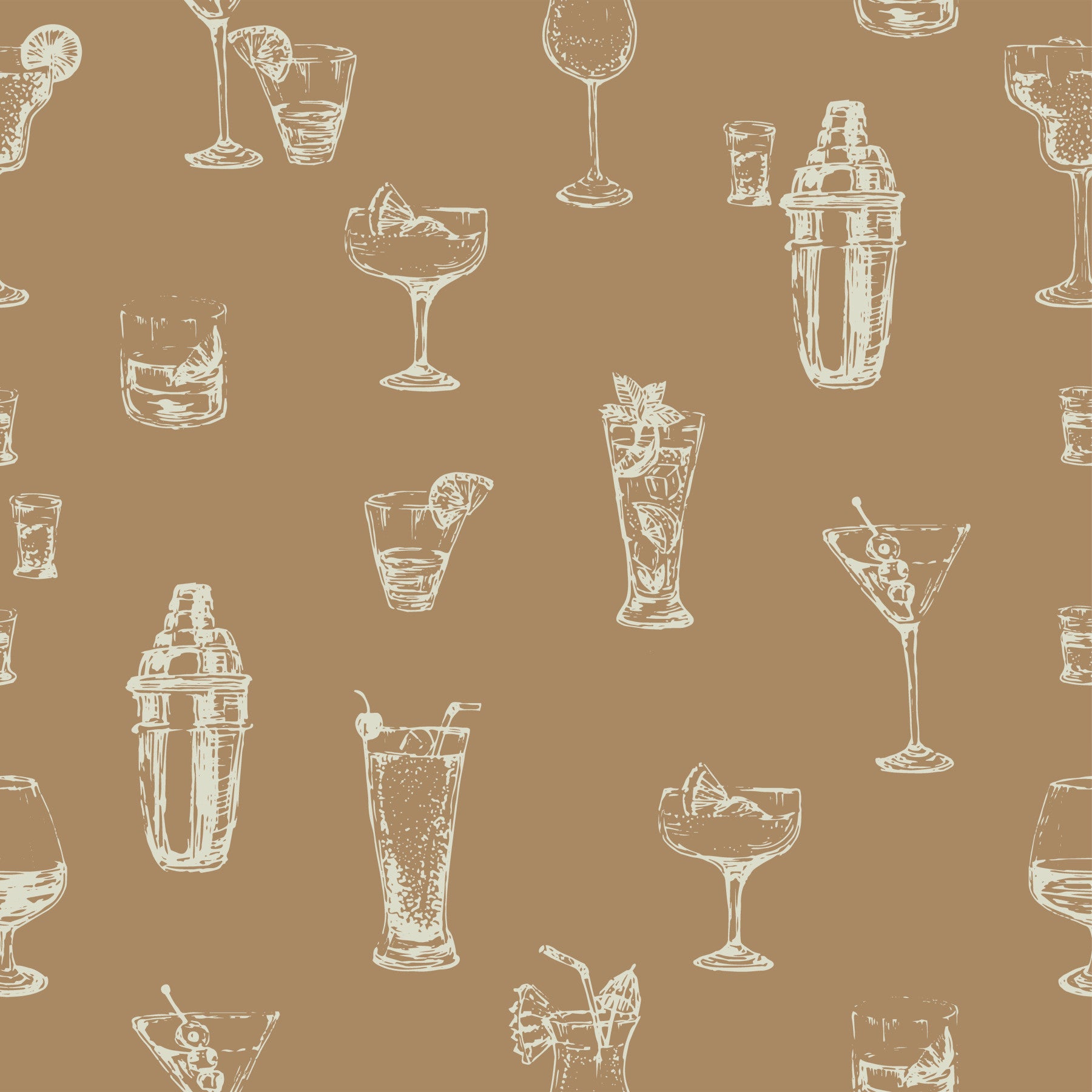 Indulge your senses with this sophisticated wallpaper design. A charming collection of hand-drawn cocktails and bar tools creates a seamless pattern in elegant off-white on a warm taupe background. The sketched style evokes a vintage cocktail lounge atmosphere, perfect for adding a touch of retro glamour to any space. This design is ideal for adding a unique and stylish touch to your home bar, kitchen, or even a dining room, bringing a sense of refined casualness to your walls. The neutral color palette makes it a versatile choice for various interior styles, from modern to classic.