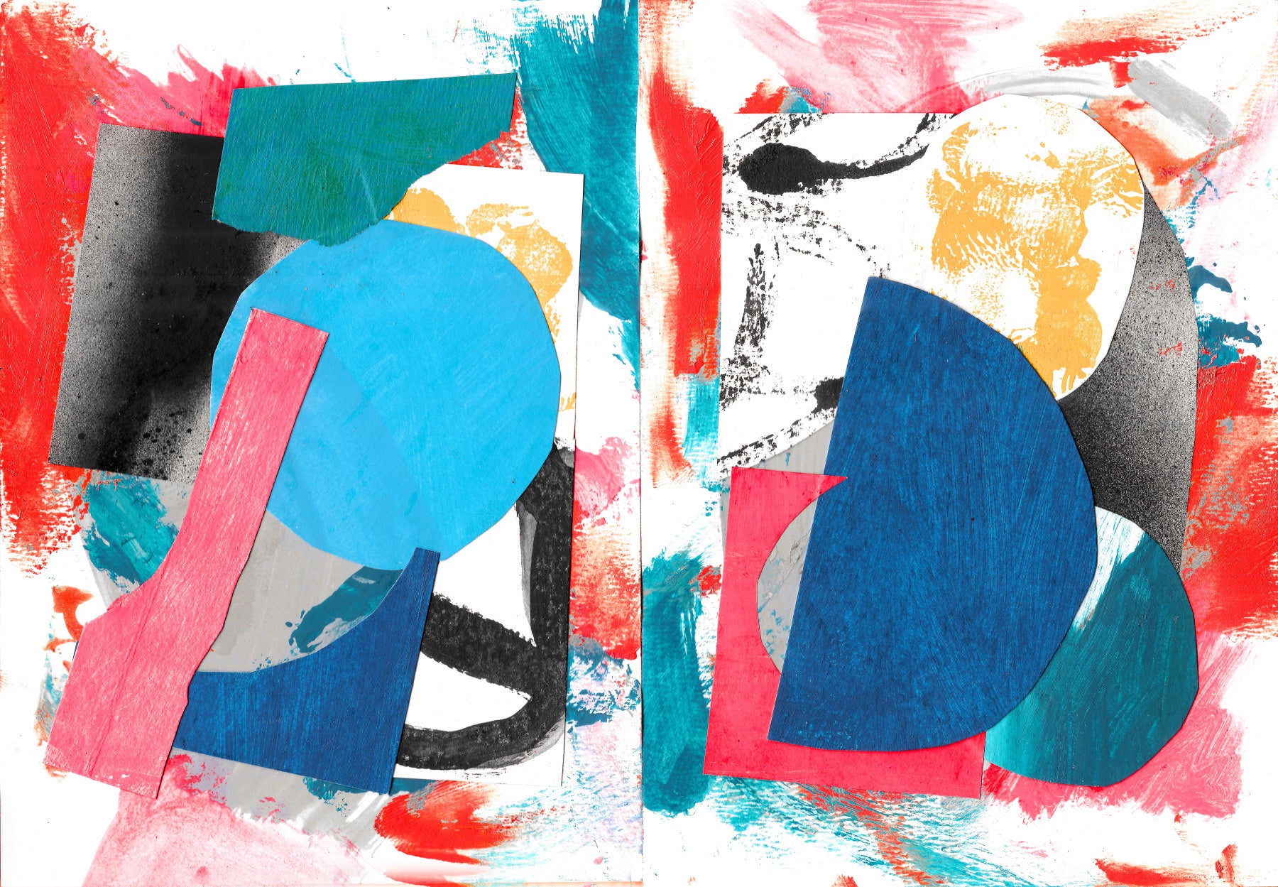 Playful Abstract Collage Wall Mural – Dynamic mural combining geometric shapes with expressive brushstroke backgrounds.