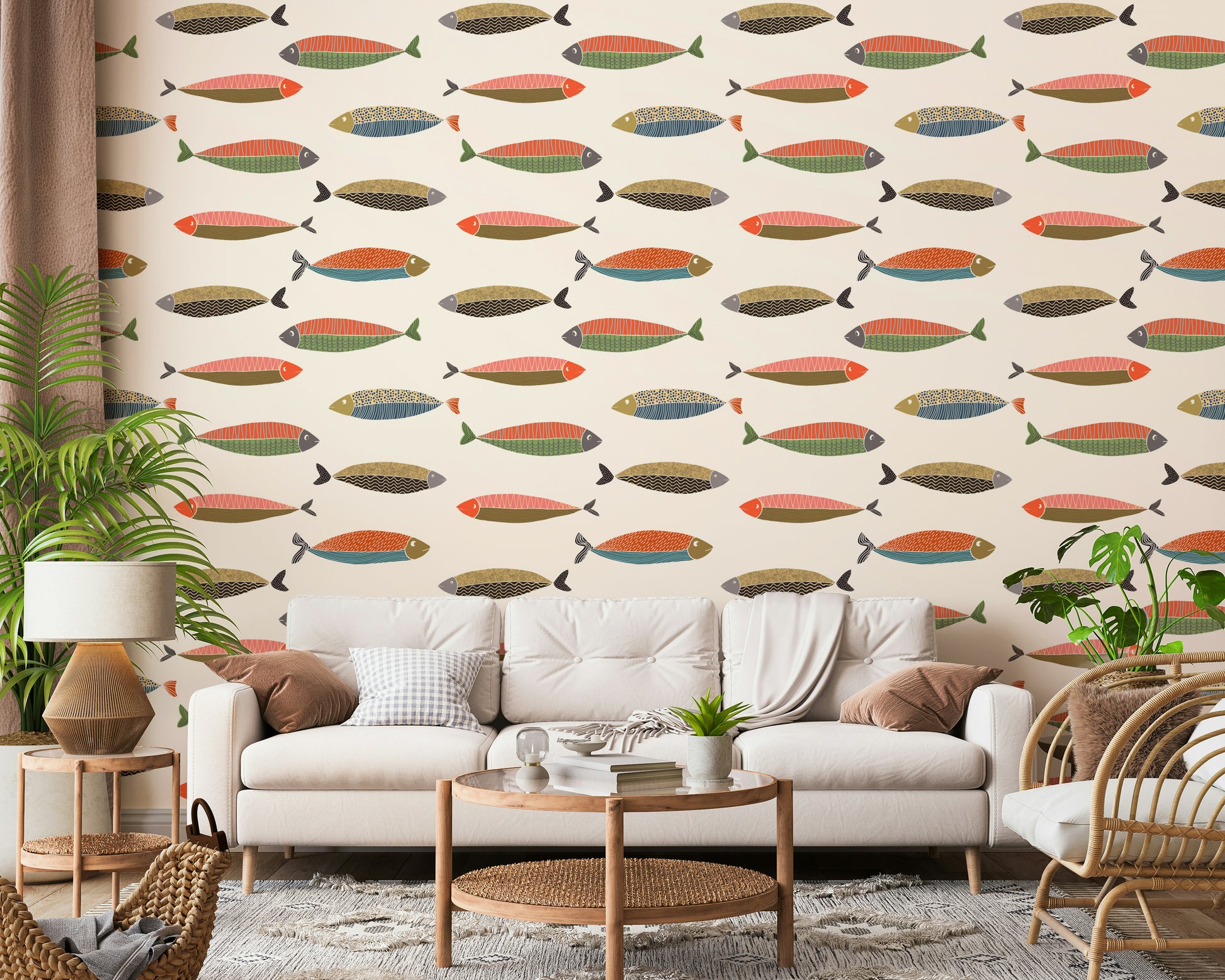 Invite an underwater extravaganza into your space with "Colourful Fish Parade". This vibrant wall décor brings a playful and artistic touch, showcasing a delightful procession of stylised fish. Each fish is uniquely adorned with a medley of patterns, from bold stripes and delicate dots to whimsical waves and scale-like textures. The rich palette of corals, blues, greens, and golds against a serene backdrop creates a captivating visual symphony. The artwork exudes a cheerful and modern aesthetic, making it an ideal addition to any room seeking a splash of colour and a touch of contemporary charm. Let these happy fish swim across your walls, bringing a sense of joy and creativity to your interior design.