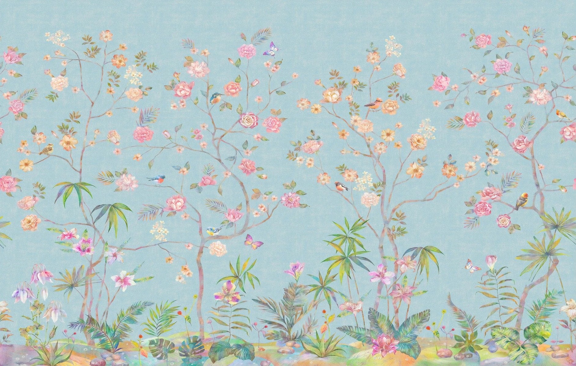 As you gaze upon the intricate pattern, notice how the dainty butterflies and charming birds come to life amongst the blossoming flowers, imparting a tranquil and soothing atmosphere. This exquisite blue wallpaper mural effortlessly transforms any room into a nature-inspired sanctuary, offering a vintage flair that is both timeless and chic.