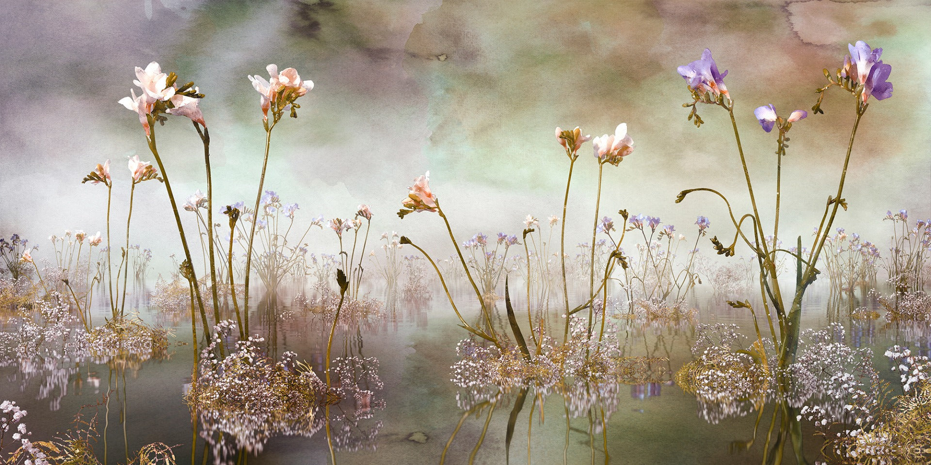 Watercolor freesia floral wallpaper for a soft, artistic wall finish.