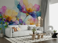 Immerse yourself in the ethereal beauty of "Colorful Ink Floral Dreams," a captivating wallpaper that evokes a sense of tranquility and artistic wonder. This design showcases a collection of stylised floral blossoms, rendered in a fluid ink technique. Swirls of vibrant hues – including radiant pinks, soothing blues, sunny yellows and vibrant purples – blend and dance across the canvas, creating a mesmerising watercolour effect. Delicate golden accents weave throughout the petals, adding a touch of opulence and highlighting the organic forms. The interplay of colour and line creates a dreamlike quality, perfect for adding a splash of artistic sophistication to any space. Let this serene and uplifting wallpaper transform your screen into a vibrant garden of abstract beauty, inspiring creativity and a sense of peaceful escape.