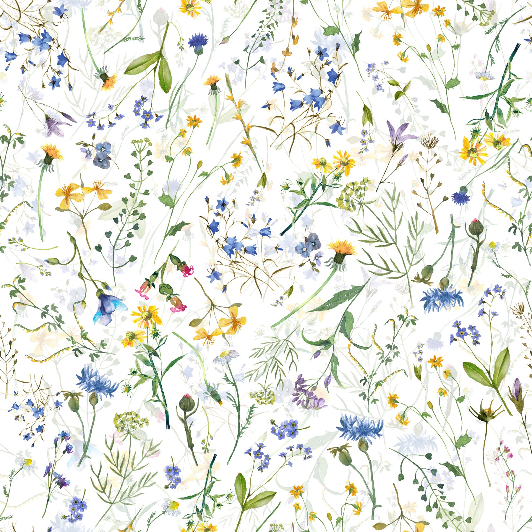 Bring the tranquility of a sun-drenched meadow into your home with this floral wallpaper by Uta Naumann. This design features a delicate watercolour style, showcasing a variety of wildflowers in soft blues, yellows, and greens. The seamless pattern creates a continuous field of blooms that feels fresh and inviting. Ideal for bedrooms, living rooms, or even a cosy kitchen, this wallpaper for walls introduces a touch of nature indoors. The light and airy feel complements any interior decor, creating a space that feels both serene and stylish.