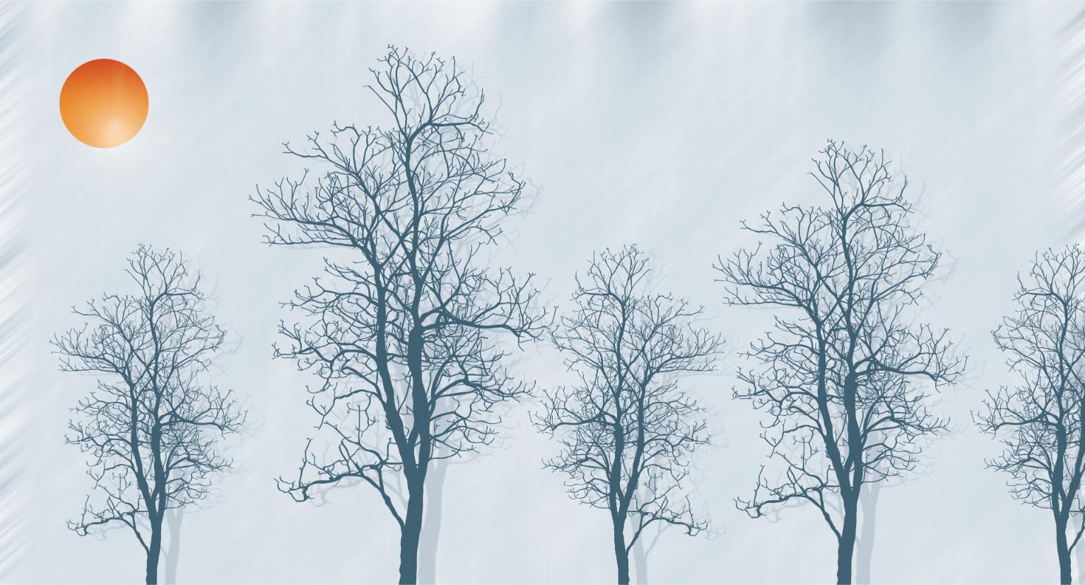 Artistic wallpaper mural featuring tree silhouettes and a red sun.