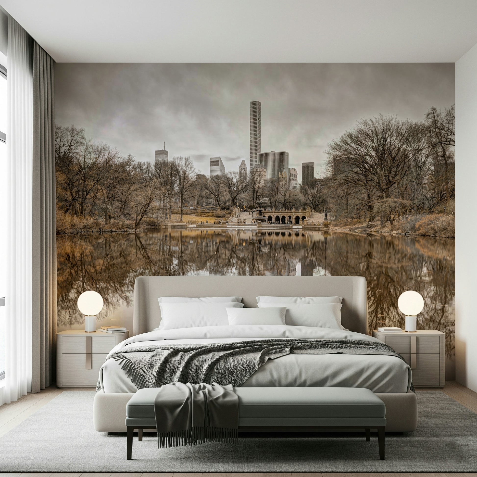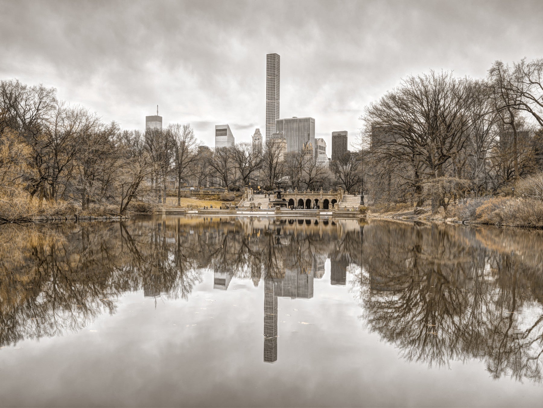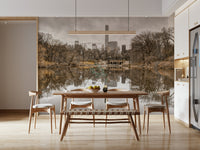 Lower Manhattan skyline from Central Park, New York. Adorn your walls with "Contrast of Worlds," a visual exploration of nature's serenity juxtaposed with urban ambition. This piece captures a tranquil body of water mirroring a skyline defined by towering architecture, showcasing the harmony and tension between organic and constructed environments. The monochromatic palette adds a timeless quality, emphasising the textures of bare trees and the sleek surfaces of city structures. The still water creates a perfect reflection, blurring the lines between reality and illusion, inviting introspection and contemplation. Ideal for spaces seeking a sophisticated and thought-provoking accent, this design serves as a reminder of the diverse yet interconnected elements that shape our world. It transforms any wall into a window offering a unique perspective on balance and coexistence, the perfect conversation starter.
