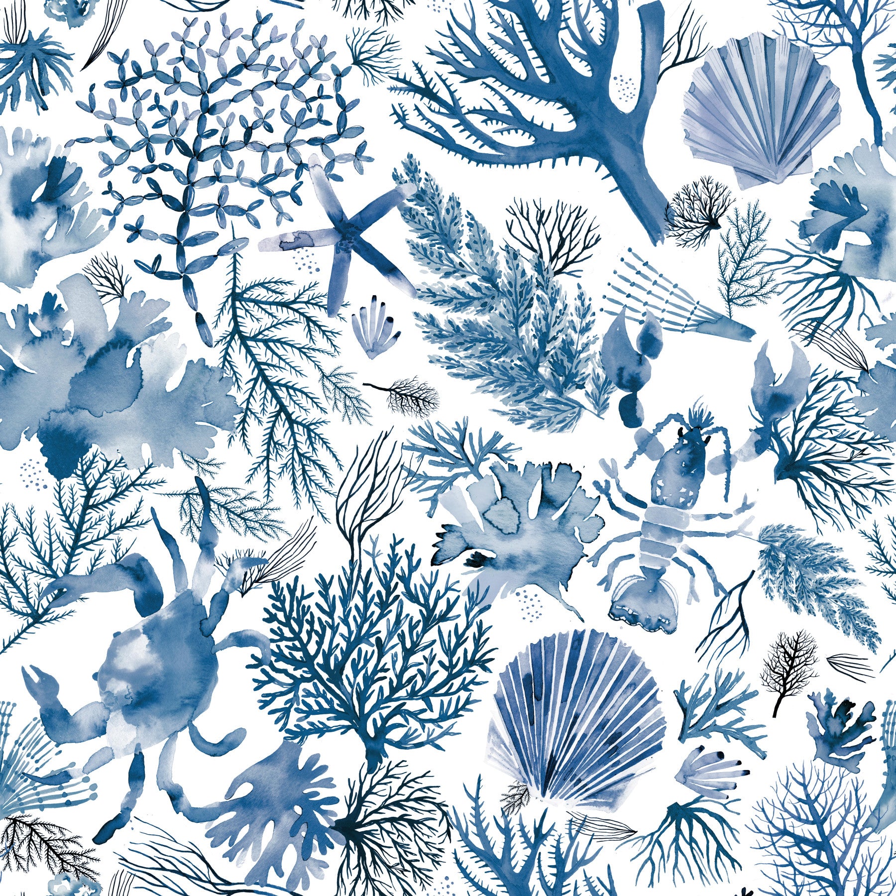Dive into tranquility with this captivating wallpaper. A serene watercolor palette of indigo blues and whites showcases a vibrant underwater scene. Intricate coral formations, delicate sea plants, and charming crustaceans—crabs and a lobster—are artfully arranged, creating a mesmerizing coastal pattern. The cool tones and elegant design evoke a sense of calm and sophistication, perfect for bringing the ocean's serenity into any space. This marine-inspired masterpiece seamlessly blends artistic beauty with coastal charm, offering a unique and refreshing visual experience.