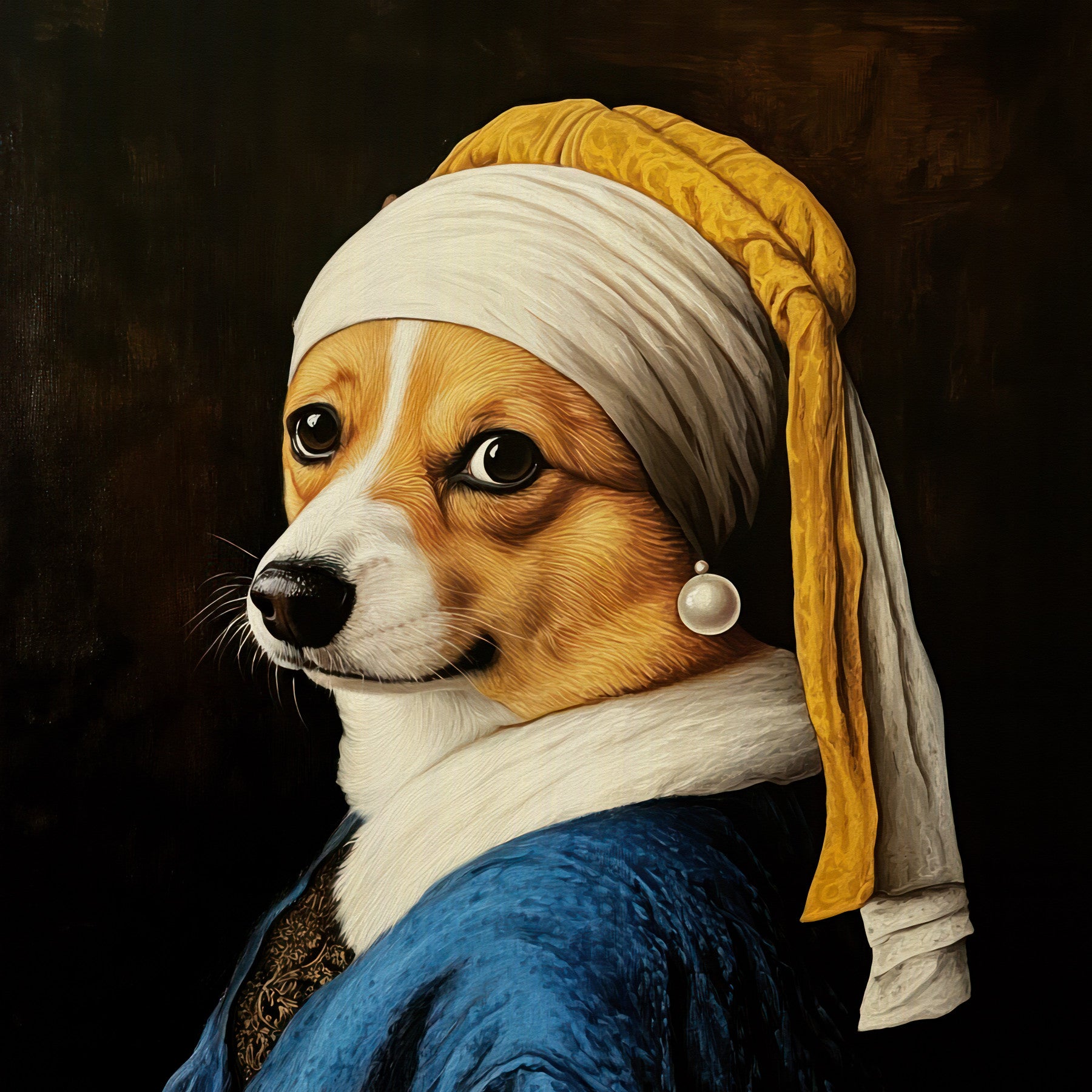 A charming and humorous take on a timeless classic, this portrait reimagines the famous girl with the pearl earring as an adorable corgi. Dressed in a flowing blue robe and wearing the iconic pearl, the corgi’s soulful eyes and dignified pose blend Renaissance elegance with playful whimsy. The deep, dark background enhances the richness of detail, making it a perfect statement piece for eclectic homes, dog lovers and art enthusiasts alike. Ideal for living rooms, creative studios or conversation-starting wall decor.