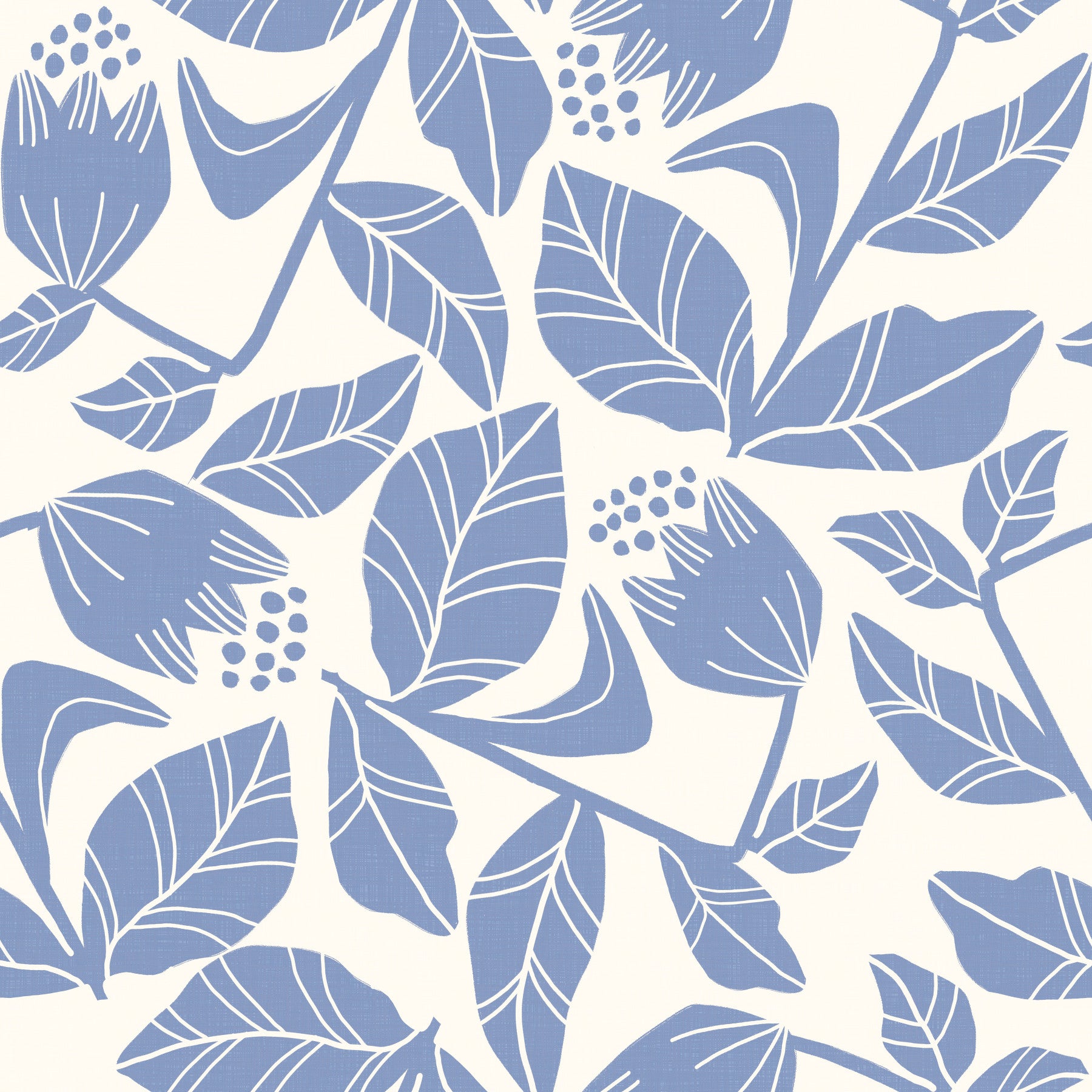 Bring understated elegance to any room with this sophisticated leaf and blossom design. Blue flowers with distinct leaves adorn an ivory backdrop. This wallpaper for walls features stylised shapes and a soft colour story. Ideal for a bathroom, nursery, or office. It presents a balance of simplicity and charm, offering a versatile accent that complements various design schemes and brightens the interiors with light tones.