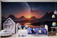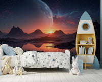 Transform your living space with this awe-inspiring wallpaper for walls. Immerse yourself in the serene beauty of a twilight landscape featuring silhouetted mountains and a fiery horizon reflecting on still waters. The celestial canvas above reveals a nebula-kissed sky, creating an evocative scene that brings the tranquility of outer space into your home. The wallpaper’s rich palette of deep blues, radiant oranges, and subtle pinks introduces both warmth and depth. Ideal for bedrooms, living rooms, or home offices, it enhances any room with a sense of wonder and a touch of otherworldly charm. The serene composition evokes a feeling of peaceful contemplation, creating a stylish backdrop that will inspire and captivate.