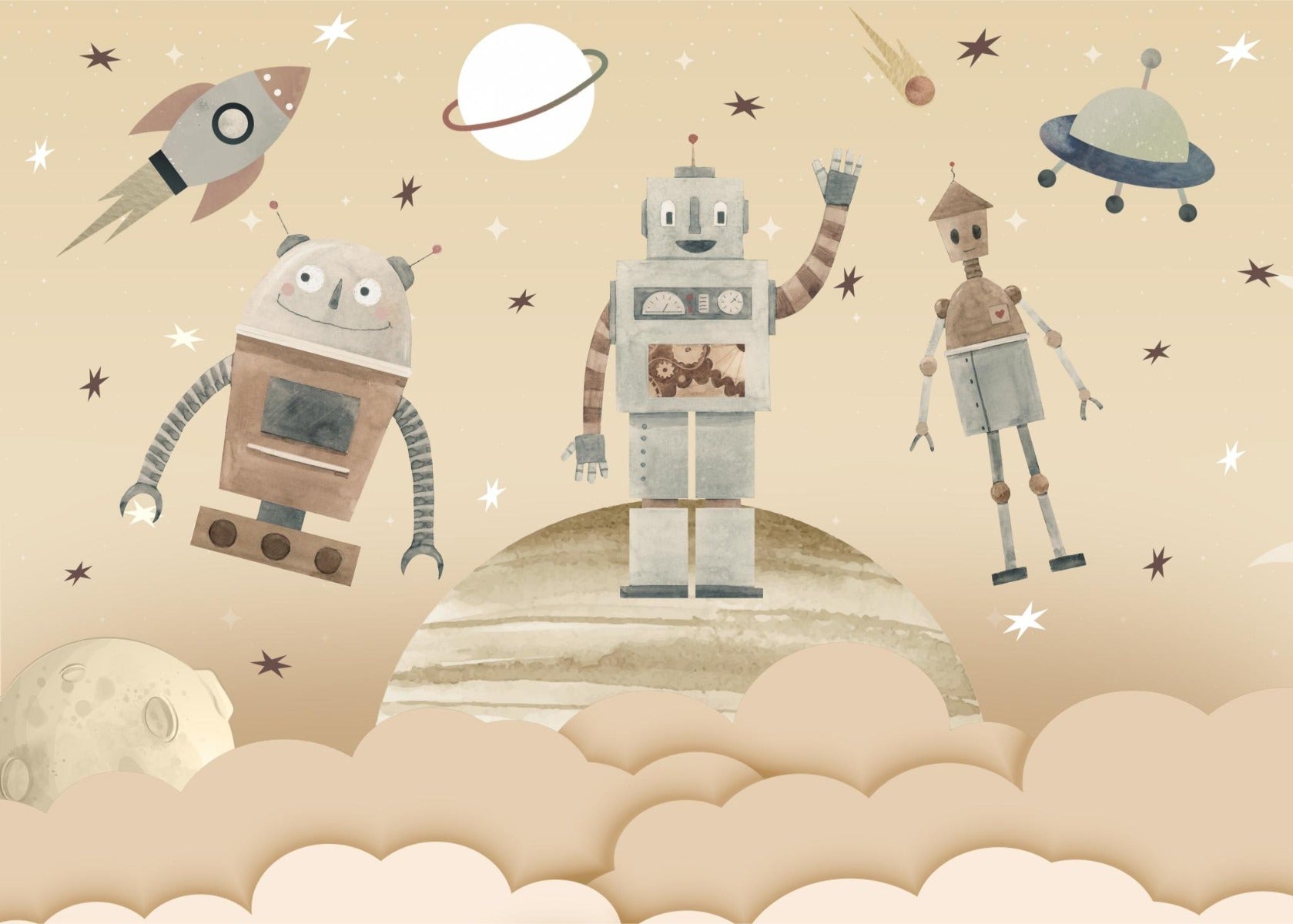 Explore the universe alongside mechanical companions! Our cosmic robots wall mural presents a playful galaxy where whimsy meets exploration. Perfect for sparking young imaginations, this kids space wallpaper showcases friendly robots in cosmic adventures. Each illustrated bot promises new stories of interstellar journeys, encouraging creative play. Launch a room's look to celestial heights no rockets needed, just imagination fueled by our captivating design.