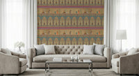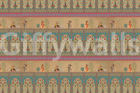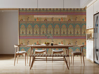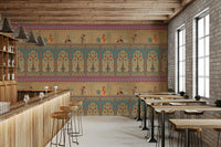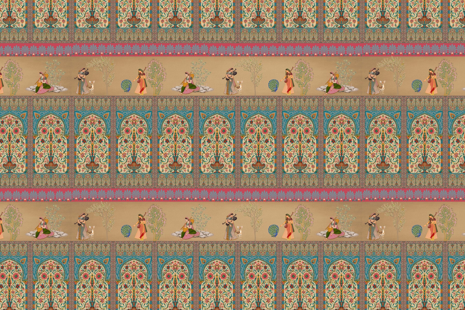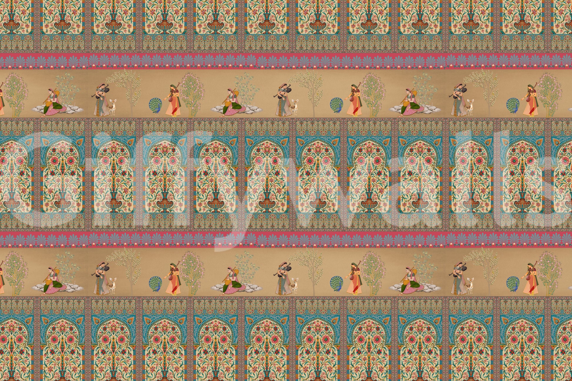 Infuse your home with the charm of a royal garden using this ornate wallpaper for walls. The design features musical figures set against a backdrop of stylised trees, flowers, and architectural motifs. The colour scheme blends soft beiges with vibrant teals, corals, and greens. This mural brings a timeless elegance to living spaces, enhancing the ambience of dining rooms and bedrooms. Its intricate patterns and soothing palettes make it suitable for creating a refined entryway or a tranquil reading nook. The elaborate detail introduces an element of classic sophistication to your décor, infusing the space with artistic allure.