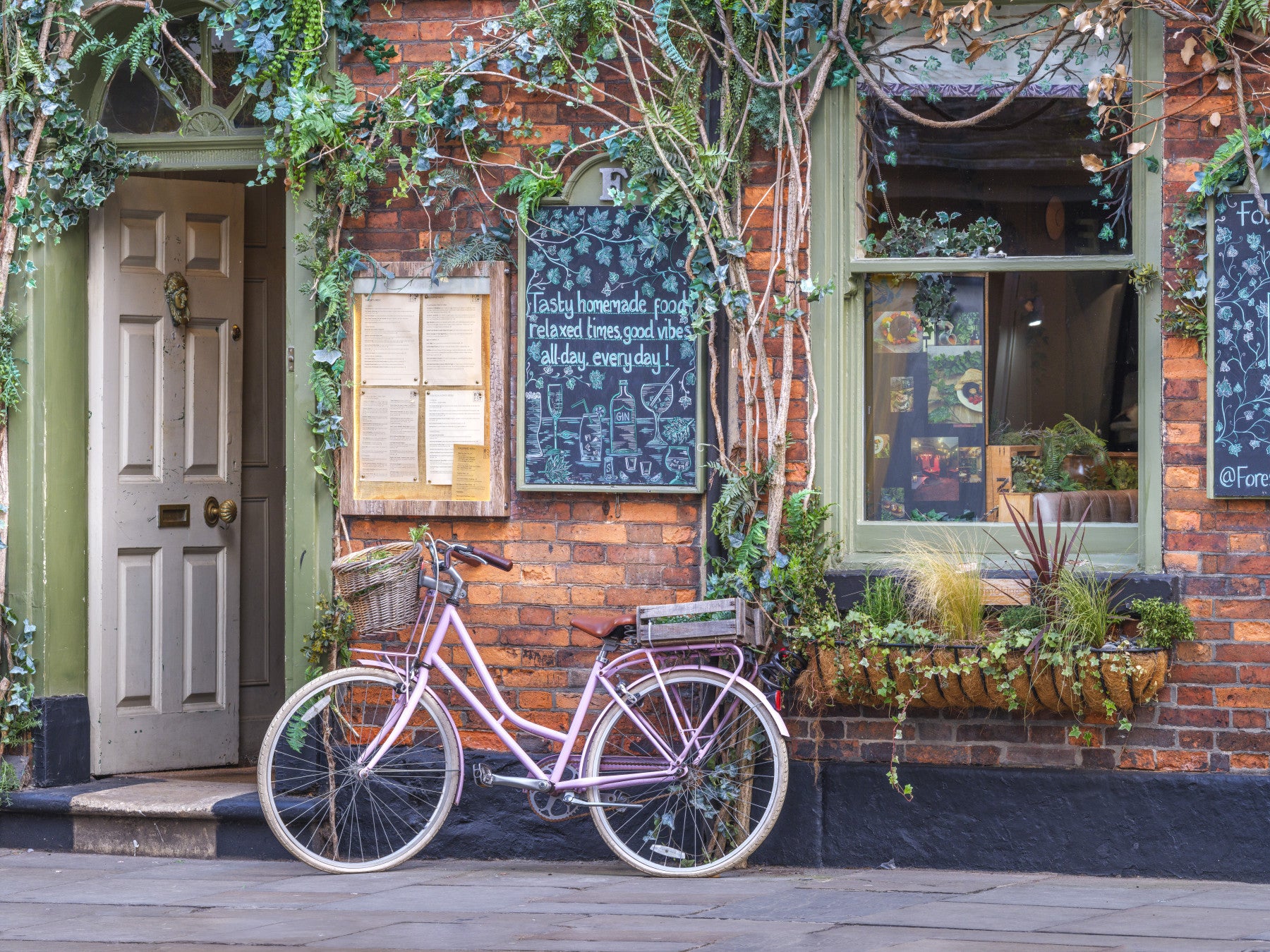 A prominent element is a pink bicycle, likely parked near the cafe entrance.