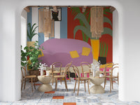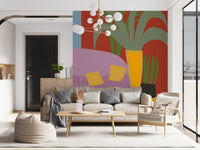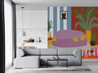 Transform your space with this charming wallpaper for walls that evokes a sense of cosiness and whimsical style. The design features bold stripes, playful potted plants, and a pair of lounging cats. A vivid colour palette of light blues, coral reds, and pastel purples creates a warm and inviting atmosphere. This wallpaper brightens children's rooms, living spaces, and even creative home offices. The whimsical motif adds character to your walls, making any room feel more lived-in and loved. Perfect for adding a lighthearted touch to interior spaces.