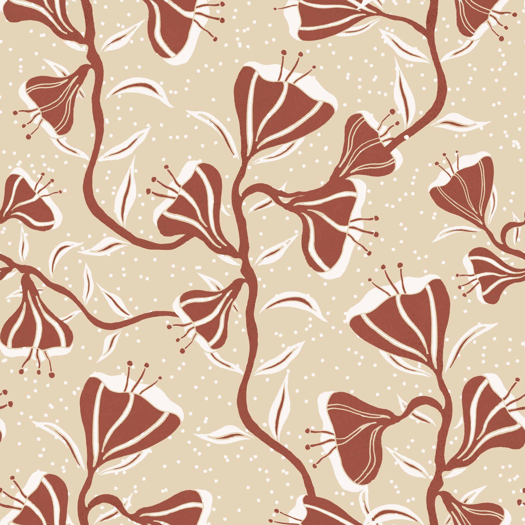 A modern interpretation of botanical art, this wallpaper features a dynamic pattern of stylized flowers and leaves in muted terracotta and off-white shades against a warm beige background. The clean lines and repeating motif create a contemporary feel, while the earthy tones ensure the design remains both sophisticated and relaxing. Its understated elegance makes it perfect for adding a touch of modern style to any space, from living rooms and bedrooms to offices and hallways.