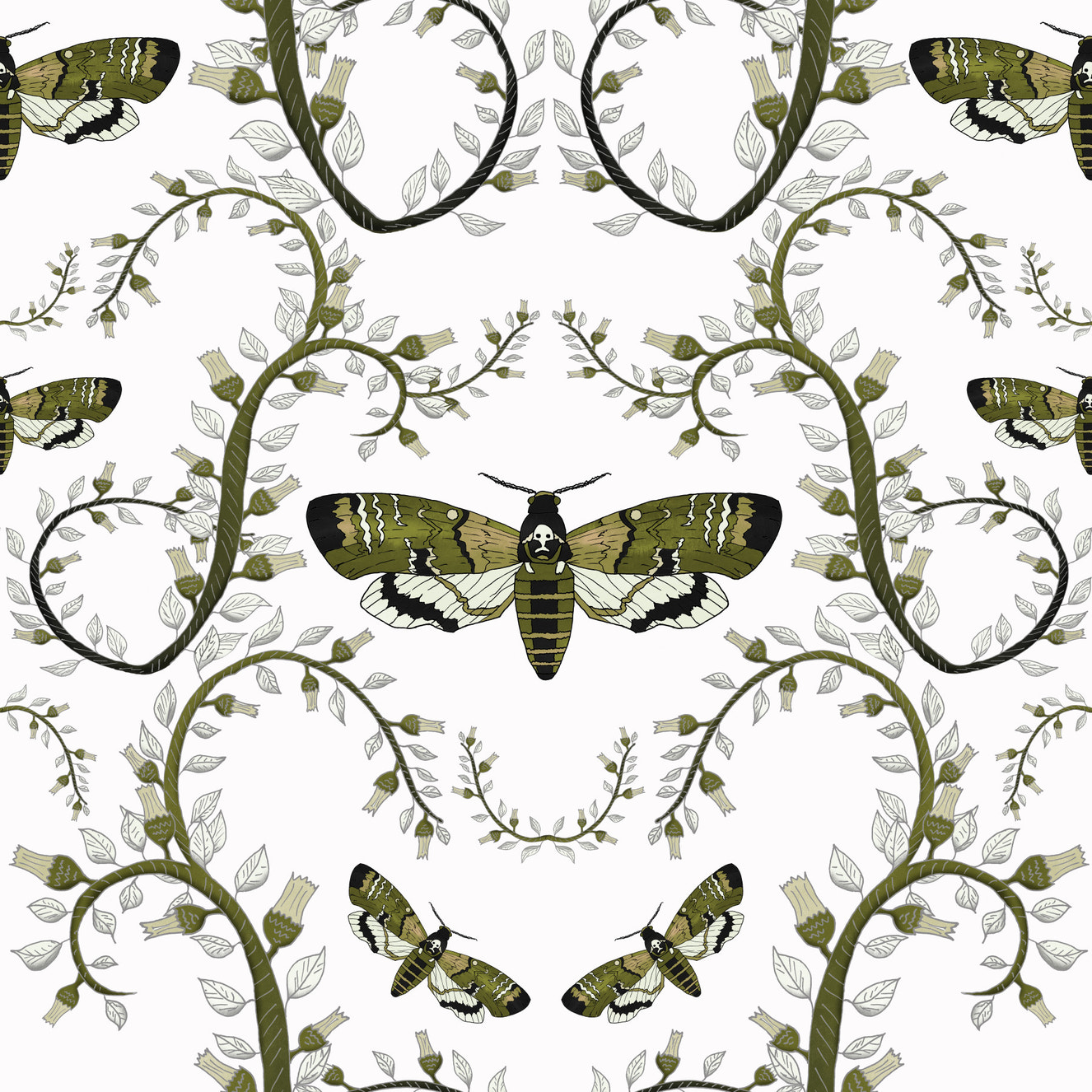 Botanical wallpaper with cream flowers and subtle vines