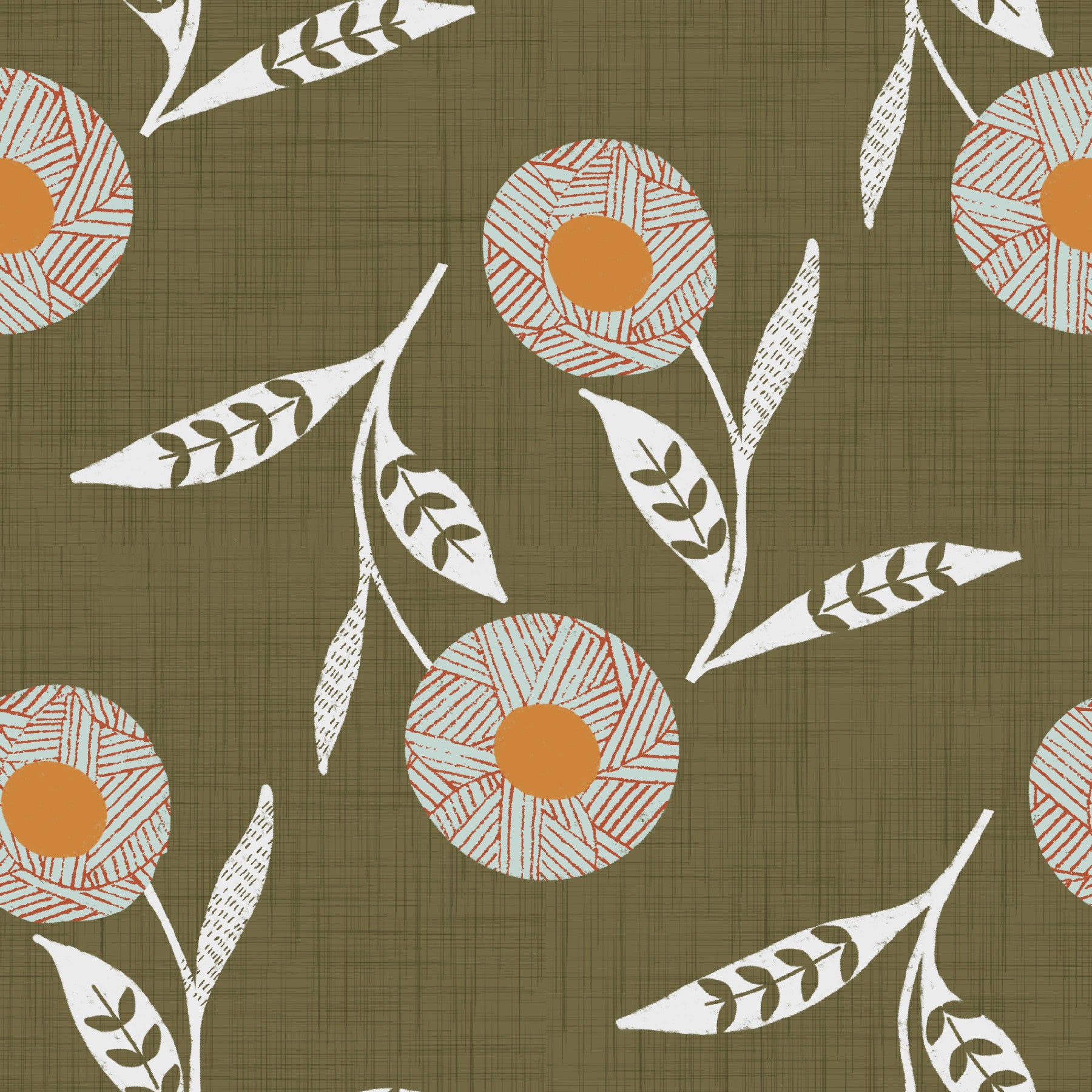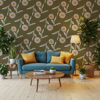Embrace the calming essence of nature with this 'Cozy Scandi Flower Earthy Olive' wall covering. This design features stylized, hand-crafted botanical motifs in a soothing palette. Olive green provides a warm, earthy backdrop for the whimsical flower heads, showcasing a blend of light blue and terracotta details that adds visual interest and texture. The simple, elegant floral shapes, paired with delicate white leaves, evoke a sense of Scandinavian minimalism and understated charm. Perfect for creating a tranquil and inviting atmosphere, this design brings a touch of the outdoors into your space, blending seamlessly with a variety of interior styles.