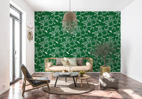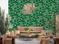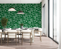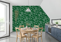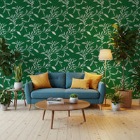 Embrace the serene beauty of nature with this 'Cozy Scandi Folk Leaf Vine Forest Green' wall covering. Its deep forest green backdrop evokes a sense of calm and tranquility, reminiscent of a lush woodland haven. Delicate, hand-crafted style white leaf vines meander across the surface, adding a touch of whimsical charm and effortless elegance. The design blends a minimalist Scandi aesthetic with folk-inspired details, creating a warm and inviting atmosphere for any room. Let this captivating wall décor transform your space into a cosy retreat, where nature's gentle embrace meets sophisticated style. Perfect for adding a touch of organic beauty to your home. This nature-inspired piece will enrich your living room or bedroom with lightheartedness.