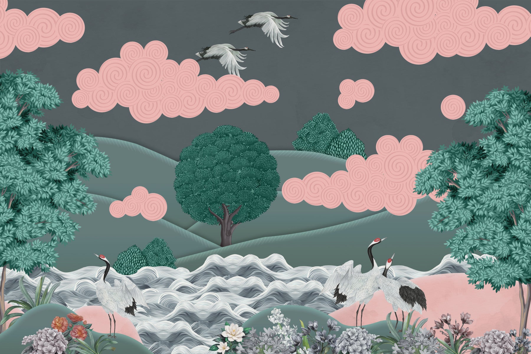 Invite a sense of calm into your home with this serene landscape design. A muted palette of teal, grey, and blush pinks creates a dreamy scene with swirling cloud formations. Delicate cranes add a touch of elegance, making this wallpaper for walls a perfect choice for bedrooms, living rooms, or even a tranquil office space. The artistic style and balanced composition will effortlessly complement minimalist or modern interiors.