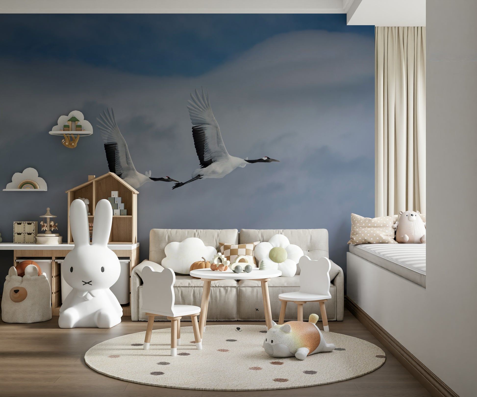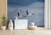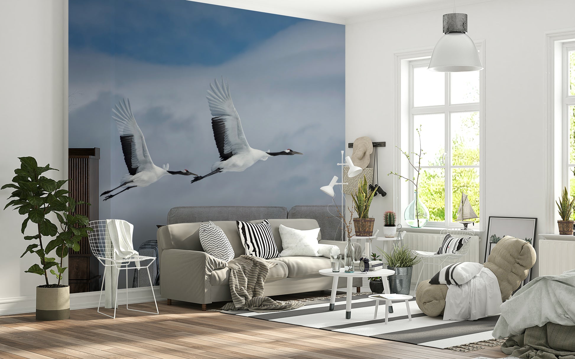 Witness the graceful dance of freedom with "Crane's Flight". This captivating wallpaper captures the serene beauty of two Japanese red-crowned cranes soaring through a vast, cloudy sky. The monochrome palette, dominated by the elegant contrast of the birds' pristine white plumage against their sleek black necks, evokes a sense of tranquility and minimalist sophistication. Their outstretched wings, meticulously detailed, embody strength and determination. The subtle textures of the overcast sky lend a touch of realism, inviting you to lose yourself in the boundless expanse of the heavens. Let this image inspire a sense of aspiration and the pursuit of one's dreams, decorating your screen with a moment of pure avian grace.