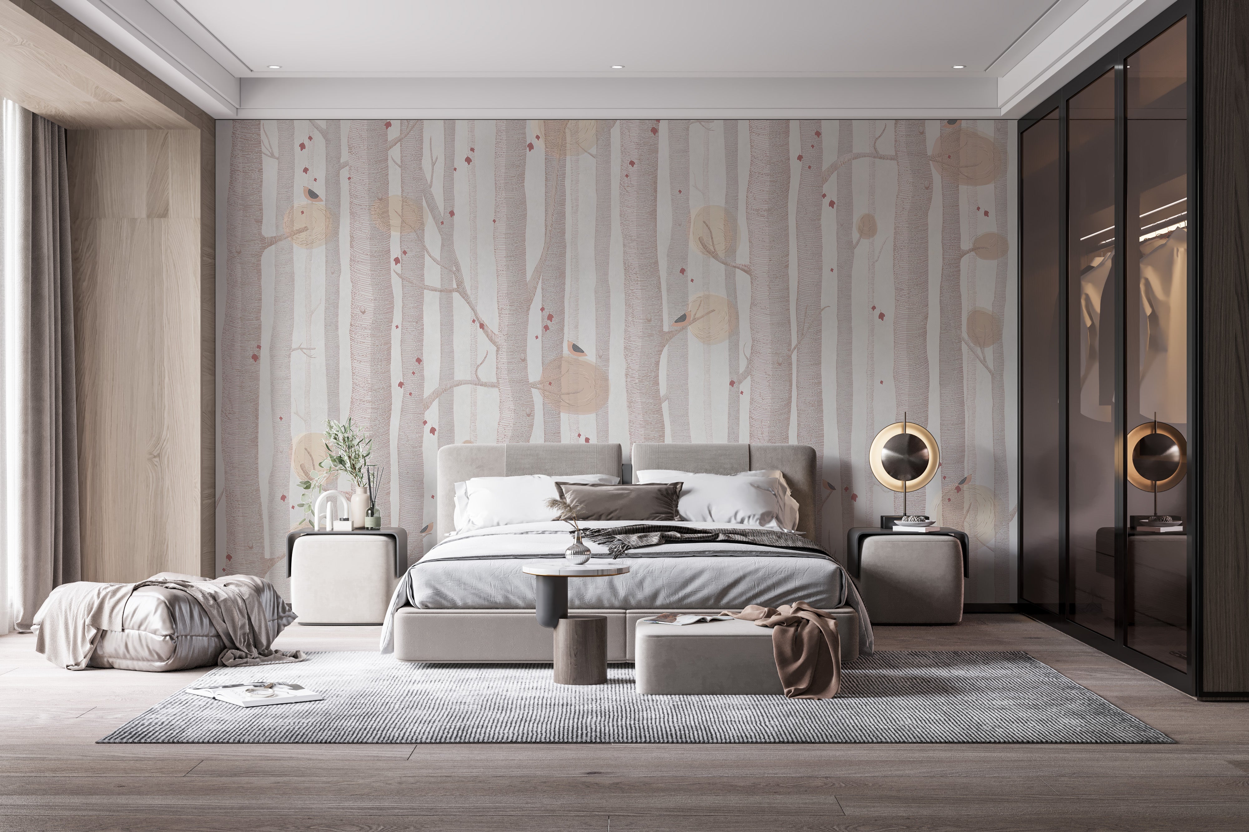 Picture a tranquil oasis, where the hustle and bustle of the world fades away to the sound of rustling leaves and soothing whispers of the wind. A bedroom should be a place of serenity, and there is no better way to create that sense of calm than with a cream-colored tree mural wallpaper. Each branch, every leaf, is carefully printed onto the creamy backdrop, creating a picturesque scene that beckons you to unwind. This wallpaper exudes a sense of sophistication and pairs perfectly with natural wood furniture or accent pieces. It's time to embrace the peaceful haven of your dream bedroom with this beautiful cream-tree wallpaper.