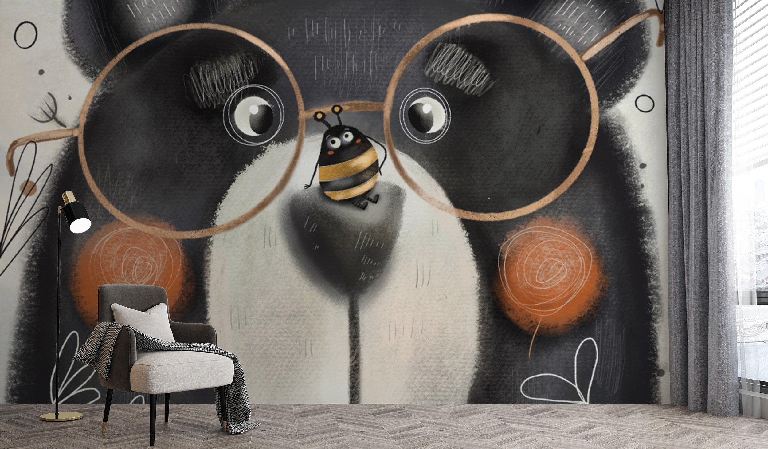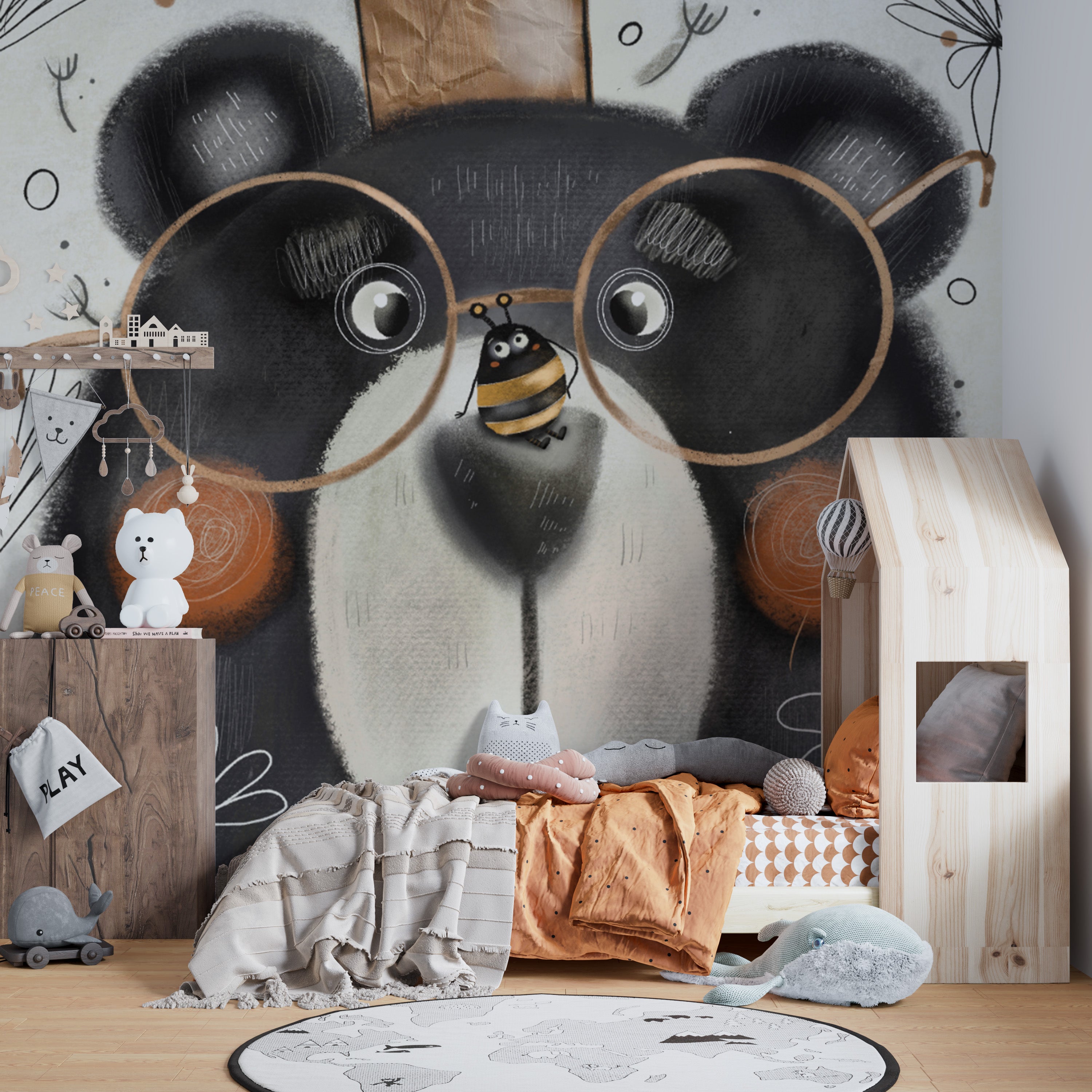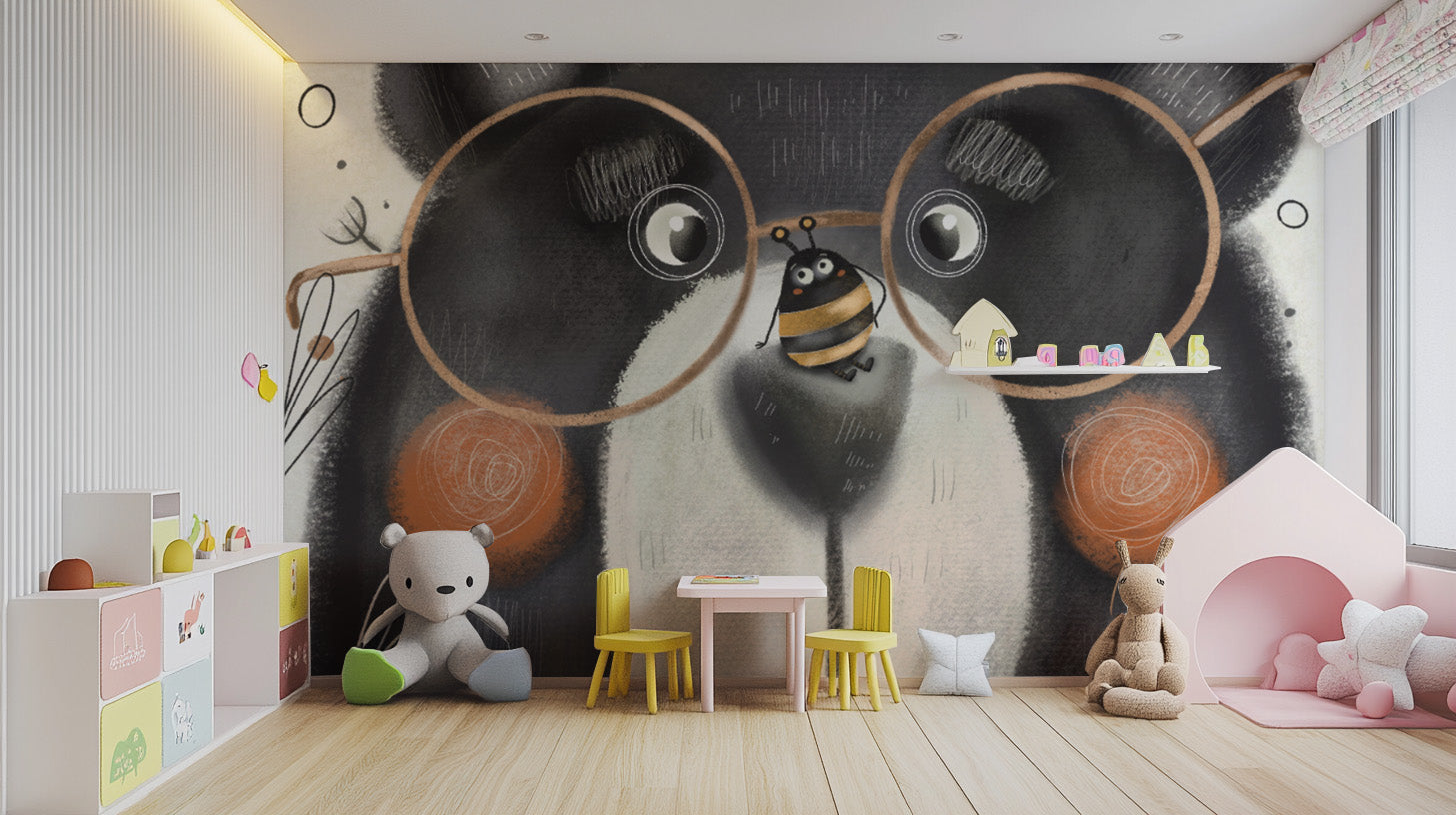 Creative Bear Face Wallpaper Mural brings a playful, funny ambiance to your house. It gives a bear with oversized glasses, a crown, and a playful bee on its nose in this wallpaper mural. Your room will have fun and become lighter by these murals since they can add a light-hearted atmosphere to the most glamorous spaces. You can use them for a little girl's bedroom decoration or a cheerful living room. Shop now and get this unique, cute mural sent free shipping to your door, adding a creative touch to your home!