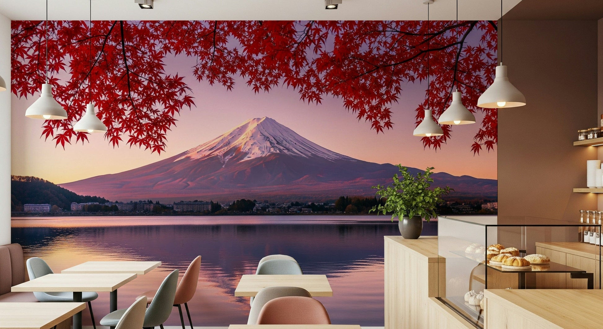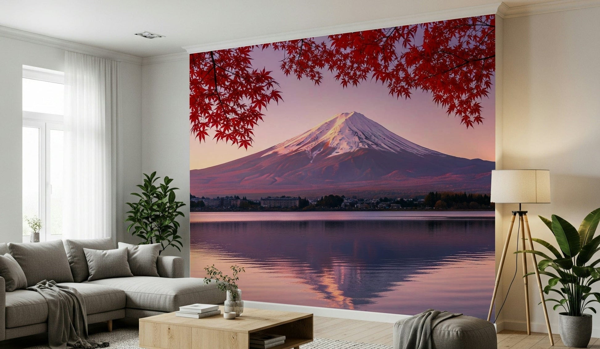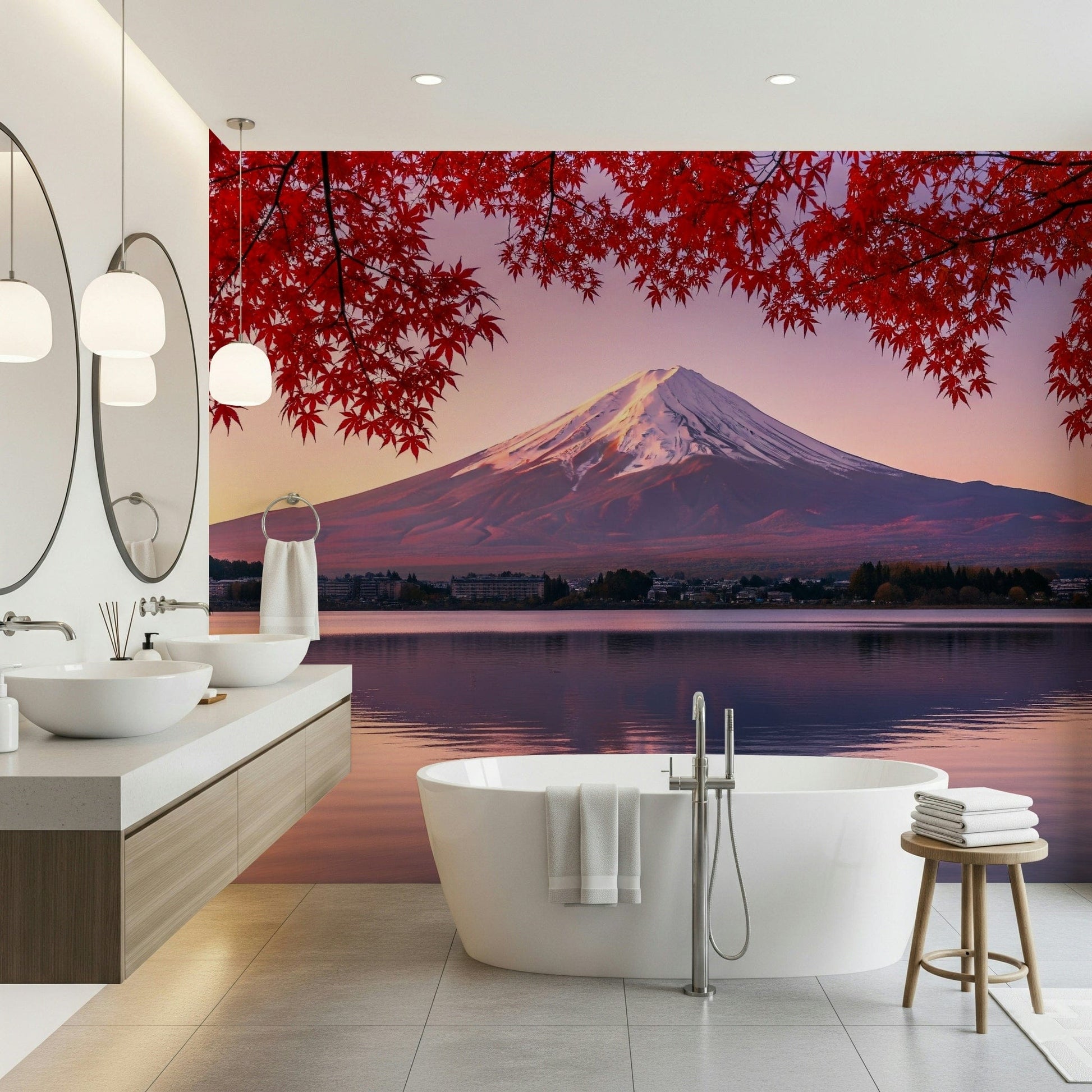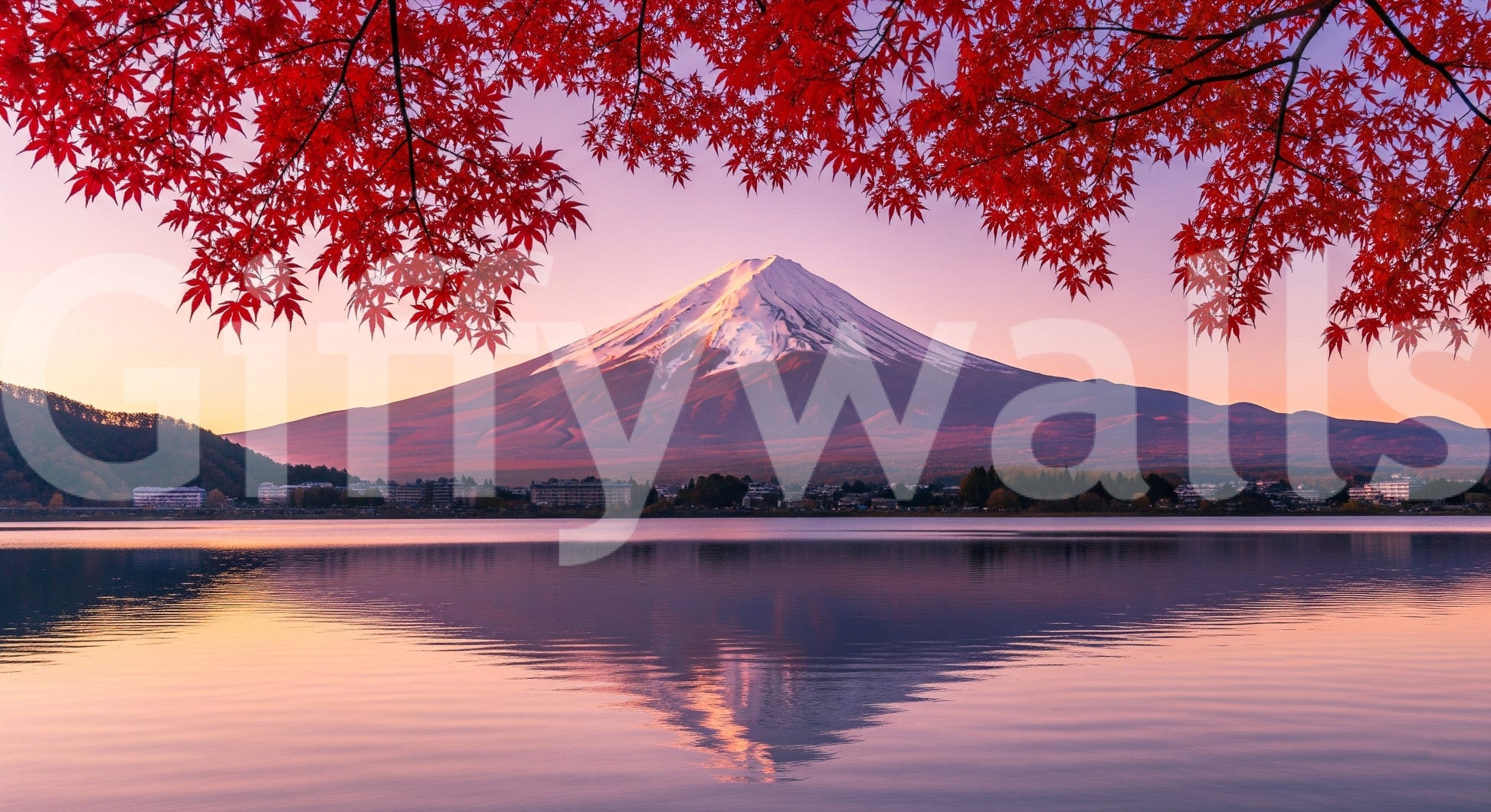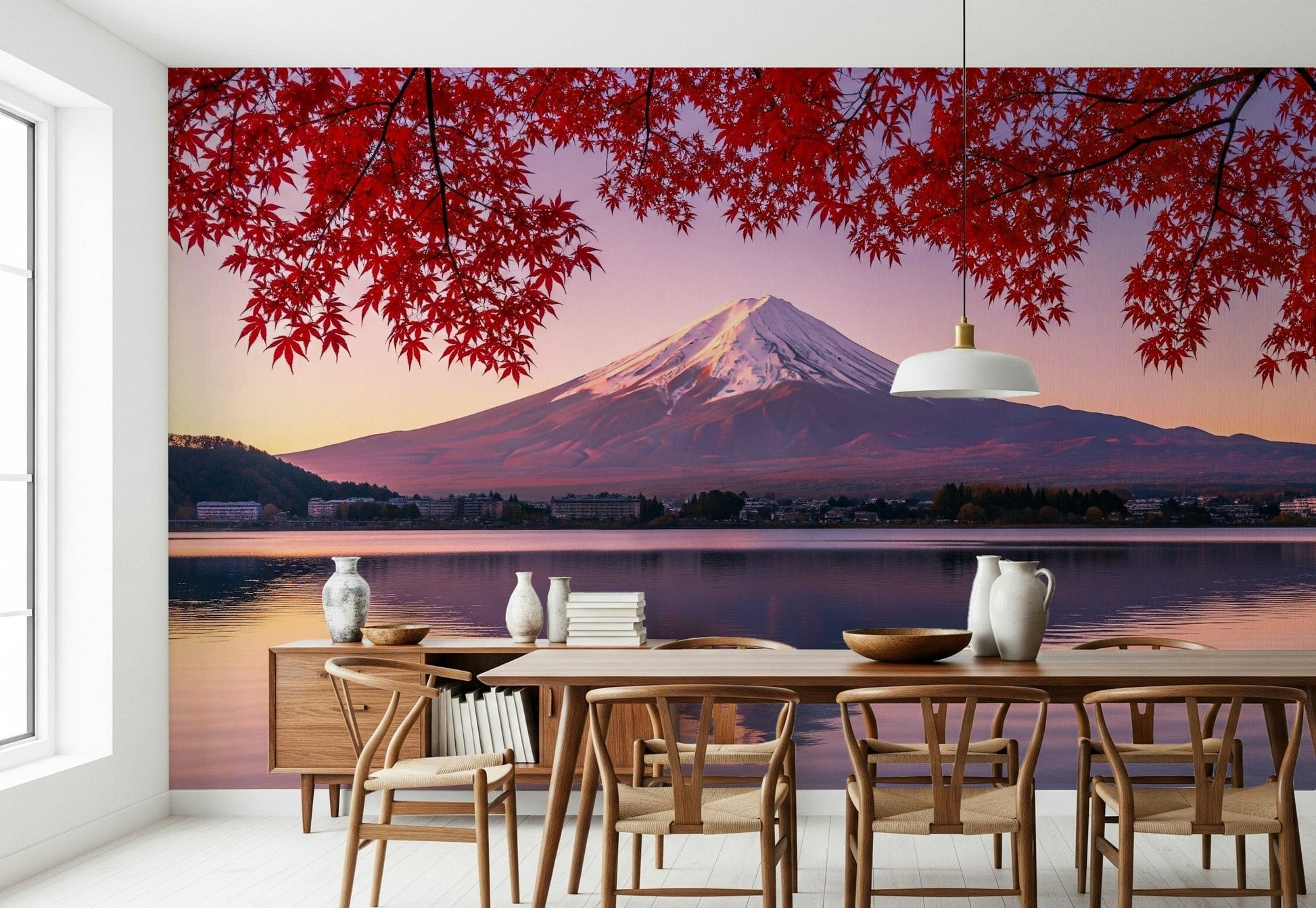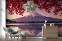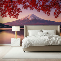 Elevate your interior design with this captivating wallpaper for walls, showcasing the iconic Mount Fuji bathed in the soft glow of dawn. The striking contrast between the snow-capped peak and the vibrant crimson foliage offers a visually stunning experience. The gentle ripples on the water's surface create an immersive feel, adding depth to any room. This unique design works perfectly in bedrooms, meditation spaces, or even entryways, inviting a sense of calm and sophistication. Introduce a touch of nature's splendour and let this landscape become a seamless extension of your personal style, enhancing the overall ambience of your home.