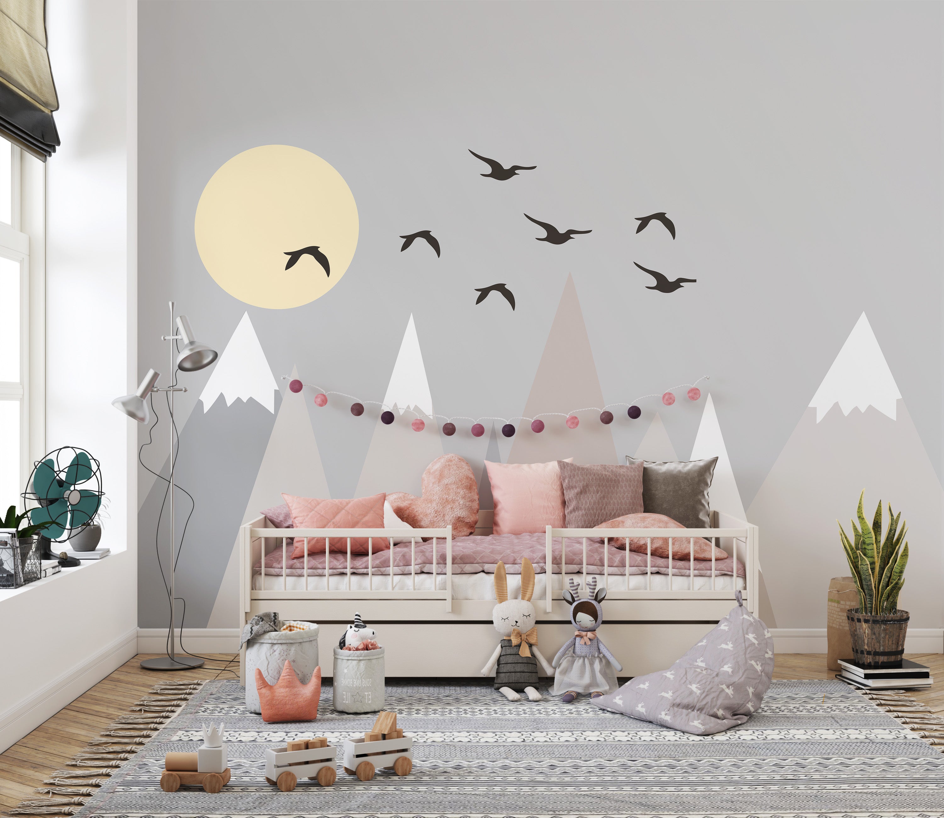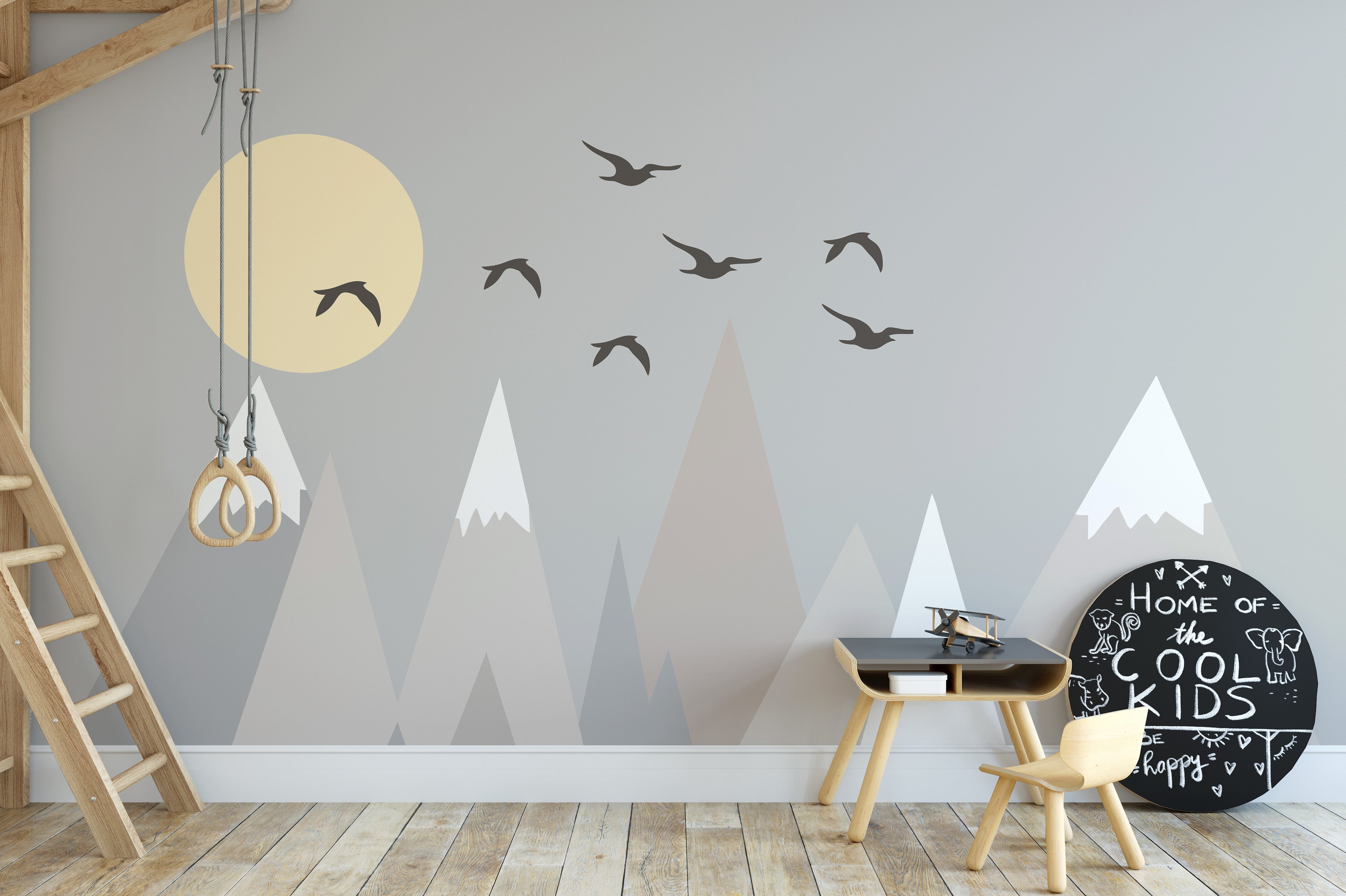 Create a magical atmosphere in your kids' room with the glorious grey mountains wallpaper mural. Featuring pastel mountains and silhouettes of flying birds, this photo mural brings nature's serenity right into your home. The grey color scheme harmonizes with any decor, making it a versatile choice for a sophisticated update.