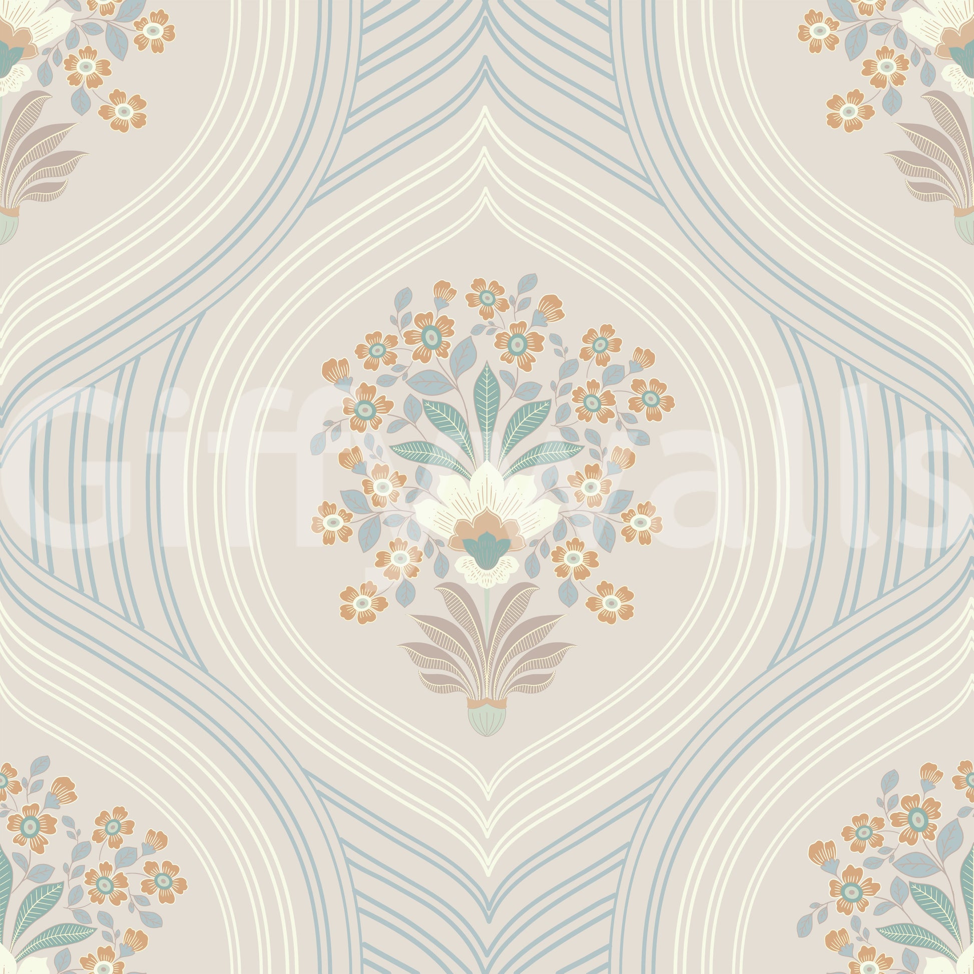 This wallpaper design features a captivating interplay of curved lines and delicate floral motifs. The flowing lines create a sense of movement and rhythm, while the soft-hued flowers add a touch of organic charm. The neutral color palette, primarily consisting of beige, soft blue-gray, and muted orange, exudes a tranquil and calming ambiance. This design is incredibly versatile, making it a perfect choice for various spaces such as bedrooms, living rooms, or hallways. The subtle yet intricate patterns add a touch of understated elegance, creating a soothing and sophisticated environment that promotes relaxation and peace. Its versatility allows for seamless integration into modern or traditional interior design schemes.