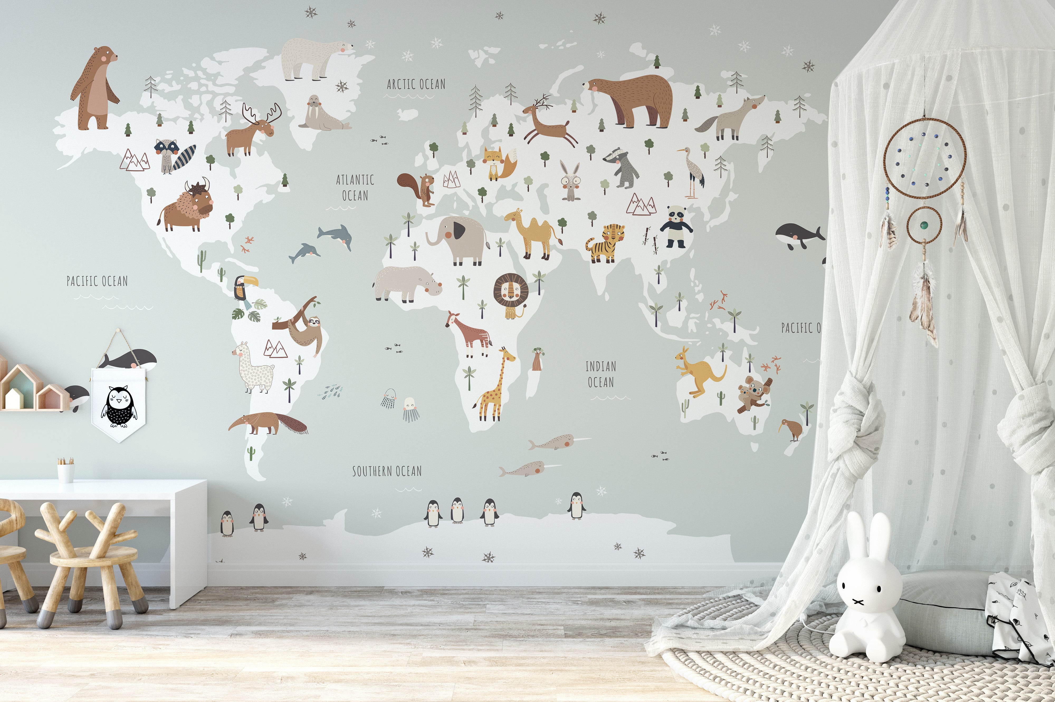 Adorable animal map mural for nursery decor