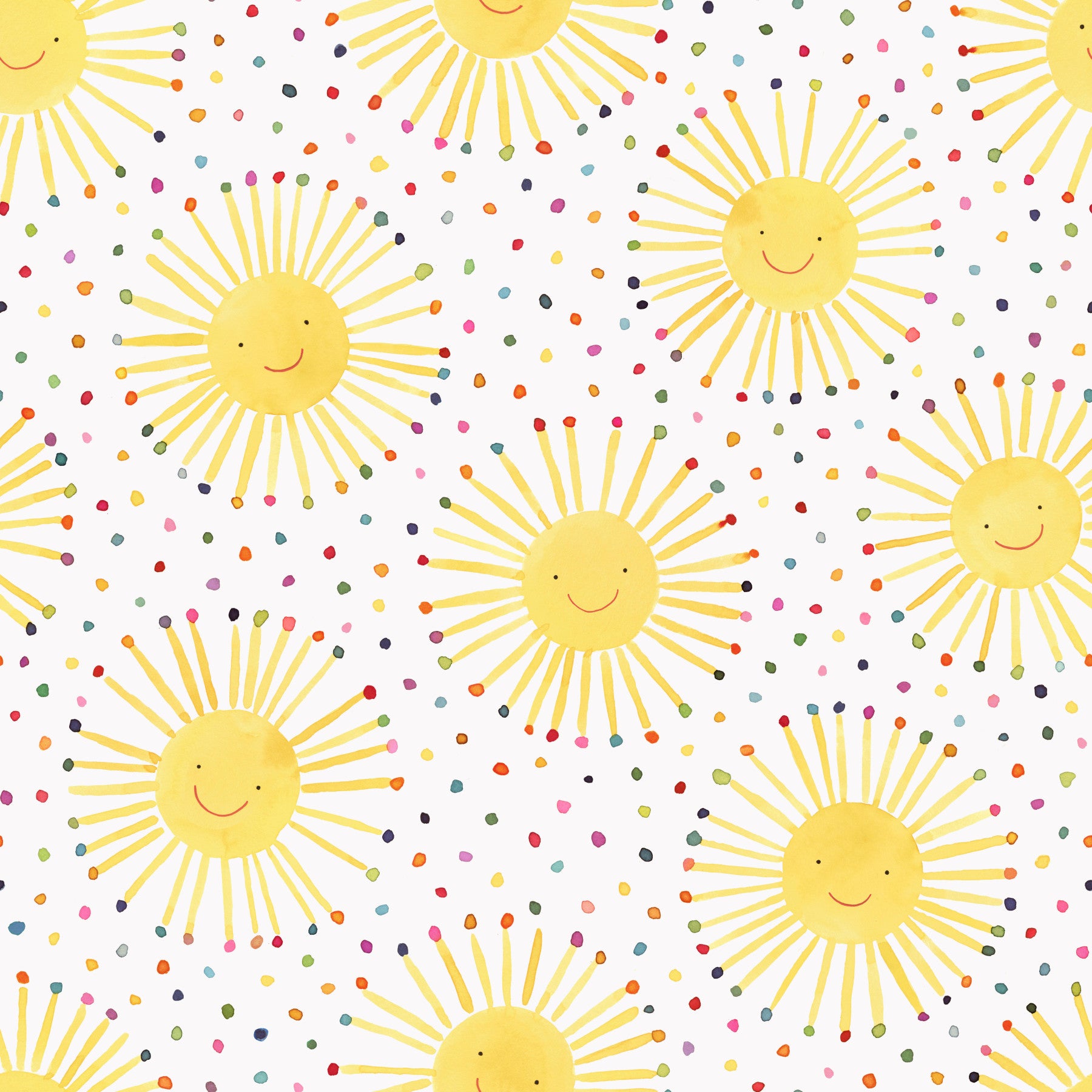 Bring sunshine and joy to your little one's room with this adorable Scandinavian-inspired nursery wallpaper! Featuring a delightful pattern of smiling suns, each with cheerful yellow faces and radiating rays, the design is playfully enhanced by a scattering of colorful dots. The watercolor-like texture adds a touch of handmade charm, creating a warm and inviting atmosphere perfect for a happy and healthy nursery. This cheerful wallpaper is guaranteed to brighten any room and fill it with positivity. The simple yet charming design embraces the minimalist aesthetic of Scandinavian design while radiating warmth and happiness. A perfect choice for a nursery or child's playroom.