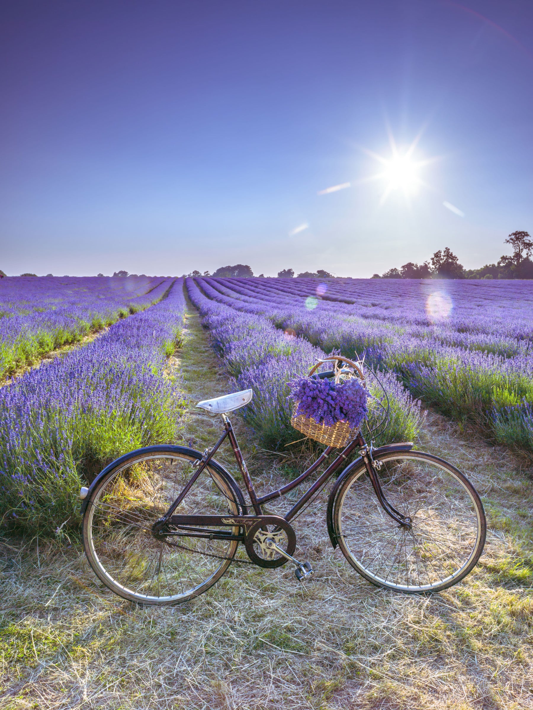 Lavender field with a resting bike wall mural for tranquil vibes.